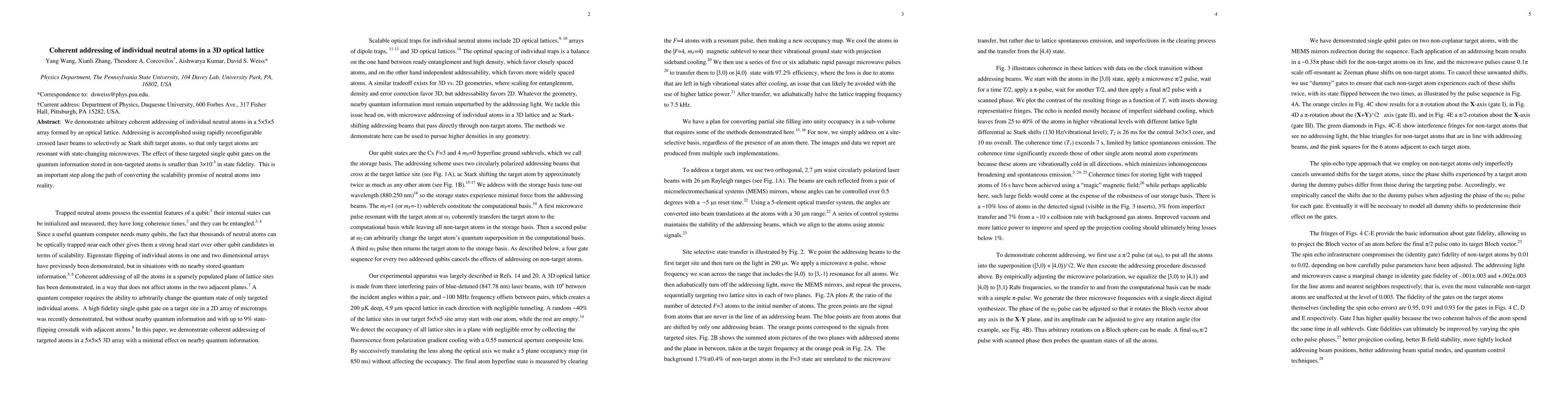 We demonstrate arbitrary coherent addressing of individual neutral atoms in a $5\times 5\times 5$ array formed by an optical lattice. Addressing is accomplished using rapidly reconfigurable crossed laser beams to selectively ac Stark shift target atoms, so that only target atoms are resonant with state-changing microwaves. The effect of these targeted single qubit gates on the quantum information stored in non-targeted atoms is smaller than $3\times 10^{-3}$ in state fidelity. This is an important step along the path of converting the scalability promise of neutral atoms into reality.