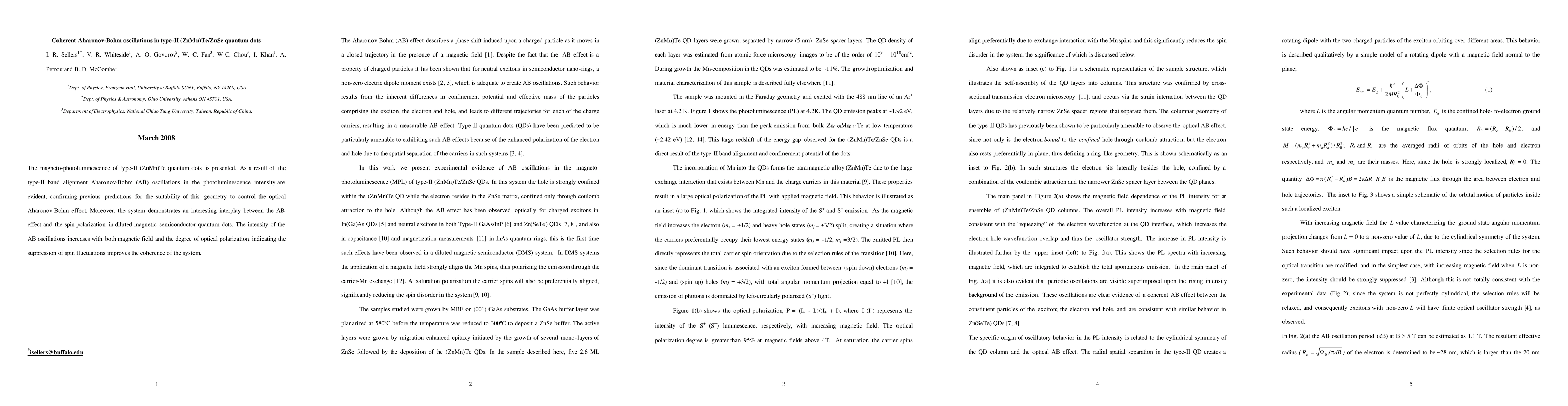 This study observes coherent Aharonov-Bohm oscillations in type-II (ZnMn)Te quantum dots through magneto-photoluminescence, confirming the optical control of the Aharonov-Bohm effect in semiconductor systems. The coherence of these oscillations enhances with increased magnetic field and optical polarization, suggesting reduced spin fluctuations.