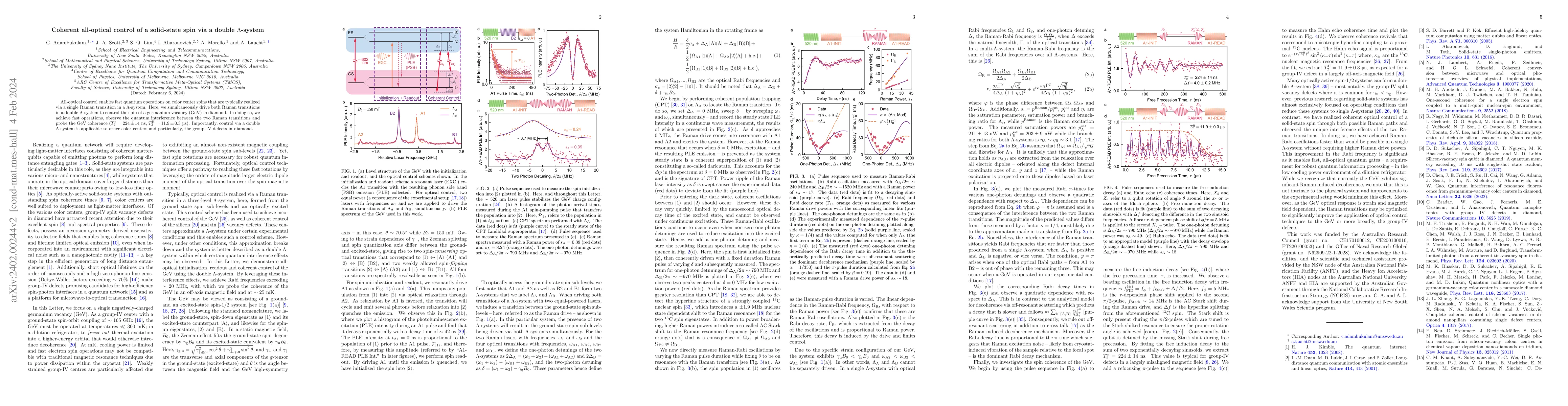 This paper demonstrates coherent all-optical control of a solid-state spin using a double $\Lambda$-system, achieving fast quantum operations on a germanium vacancy in diamond. The study observes quantum interference and measures spin coherence times, highlighting the potential for broader applications to other color centers in diamond.