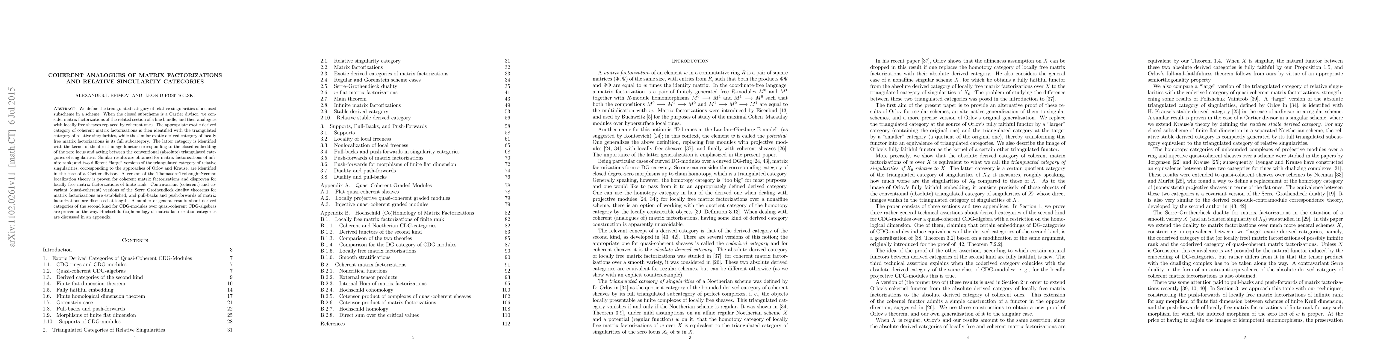 We define the triangulated category of relative singularities of a closed subscheme in a scheme. When the closed subscheme is a Cartier divisor, we consider matrix factorizations of the related section of a line bundle, and their analogues with locally free sheaves replaced by coherent ones. The appropriate exotic derived category of coherent matrix factorizations is then identified with the triangulated category of relative singularities, while the similar exotic derived category of locally free matrix factorizations is its full subcategory. The latter category is identified with the kernel of the direct image functor corresponding to the closed embedding of the zero locus and acting between the conventional (absolute) triangulated categories of singularities. Similar results are obtained for matrix factorizations of infinite rank; and two different "large" versions of the triangulated category of relative singularities, corresponding to the approaches of Orlov and Krause, are identified in the case of a Cartier divisor. A version of the Thomason-Trobaugh-Neeman localization theory is proven for coherent matrix factorizations and disproven for locally free matrix factorizations of finite rank. Contravariant (coherent) and covariant (quasi-coherent) versions of the Serre-Grothendieck duality theorems for matrix factorizations are established, and pull-backs and push-forwards of matrix factorizations are discussed at length. A number of general results about derived categories of the second kind for CDG-modules over quasi-coherent CDG-algebras are proven on the way. Hochschild (co)homology of matrix factorization categories are discussed in an appendix.