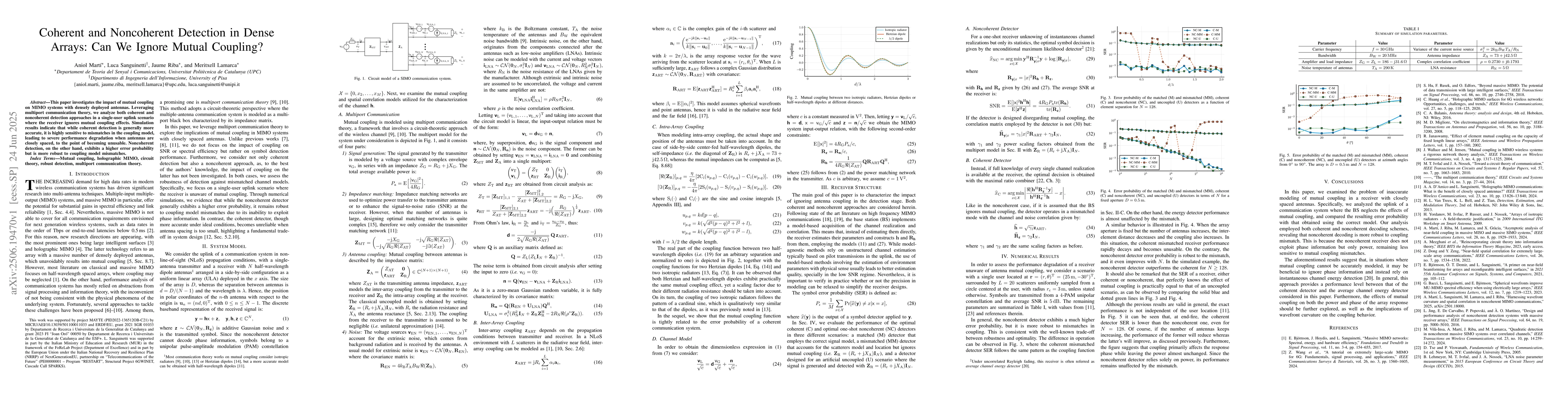 This paper investigates the impact of mutual coupling on MIMO systems with densely deployed antennas. Leveraging multiport communication theory, we analyze both coherent and noncoherent detection approaches in a single-user uplink scenario where the receiver ignores mutual coupling effects. Simulation results indicate that while coherent detection is generally more accurate, it is highly sensitive to mismatches in the coupling model, leading to severe performance degradation when antennas are closely spaced, to the point of becoming unusable. Noncoherent detection, on the other hand, exhibits a higher error probability but is more robust to coupling model mismatches.