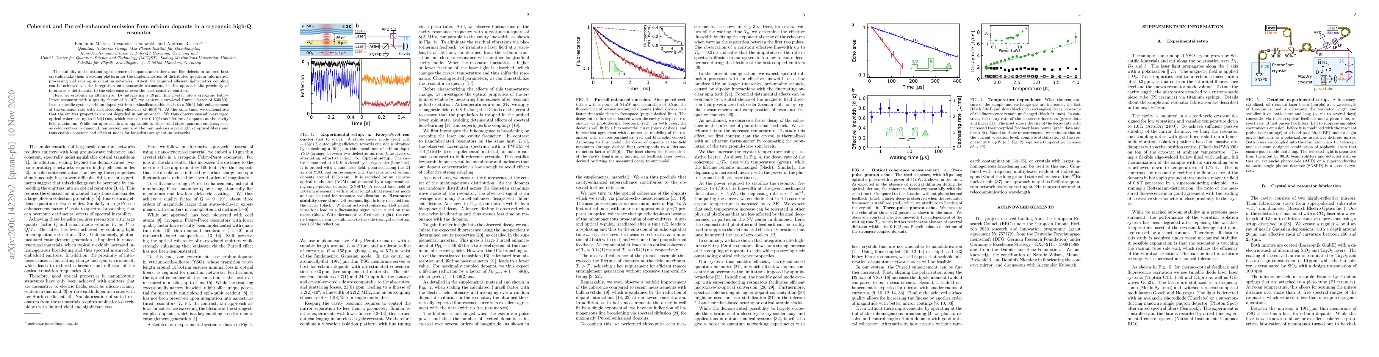 The stability and outstanding coherence of dopants and other atom-like defects in tailored host crystals make them a leading platform for the implementation of distributed quantum information processing and sensing in quantum networks. Albeit the required efficient light-matter coupling can be achieved via the integration into nanoscale resonators, in this approach the proximity of interfaces is detrimental to the coherence of even the least-sensitive emitters. Here, we establish an alternative: By integrating a 19 micrometer thin erbium-doped crystal into a cryogenic Fabry-Perot resonator with a quality factor of nine million, we can demonstrate 59(6)-fold enhancement of the emission rate, corresponding to a two-level Purcell factor of 530(50), while preserving lifetime-limited optical coherence up to 0.54(1) ms. With its emission at the minimal-loss wavelength of optical fibers and its outcoupling efficiency of 46(8) %, our system enables coherent and efficient nodes for long-distance quantum networks.