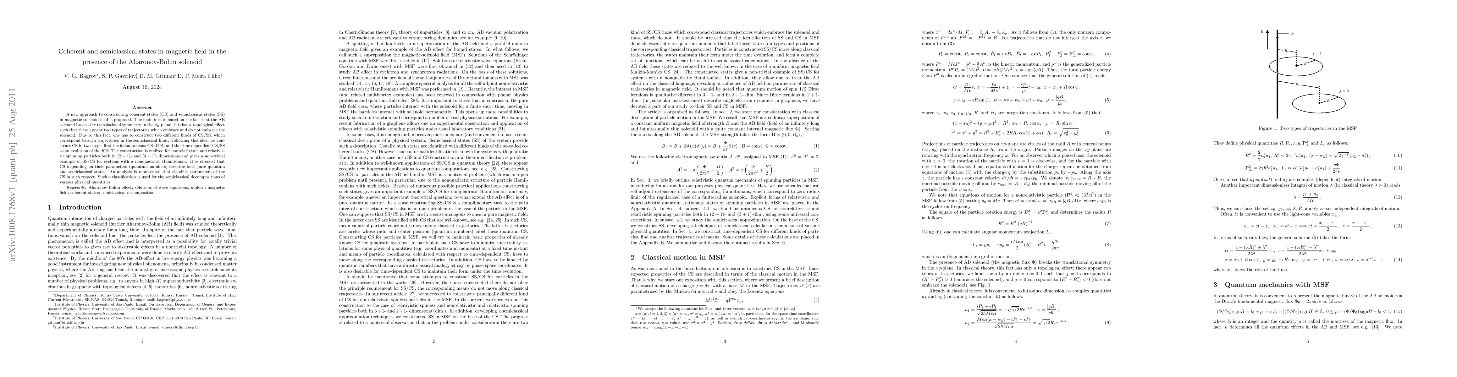 A new approach to constructing coherent states (CS) and semiclassical states (SS) in magnetic-solenoid field is proposed. The main idea is based on the fact that the AB solenoid breaks the translational symmetry in the xy-plane, this has a topological effect such that there appear two types of trajectories which embrace and do not embrace the solenoid. Due to this fact, one has to construct two different kinds of CS/SS, which correspond to such trajectories in the semiclassical limit. Following this idea, we construct CS in two steps, first the instantaneous CS (ICS) and the time dependent CS/SS as an evolution of the ICS. The construction is realized for nonrelativistic and relativistic spinning particles both in (2+1)- and (3+1)- dimensions and gives a non-trivial example of SS/CS for systems with a nonquadratic Hamiltonian. It is stressed that CS depending on their parameters (quantum numbers) describe both pure quantum and semiclassical states. An analysis is represented that classifies parameters of the CS in such respect. Such a classification is used for the semiclassical decompositions of various physical quantities.