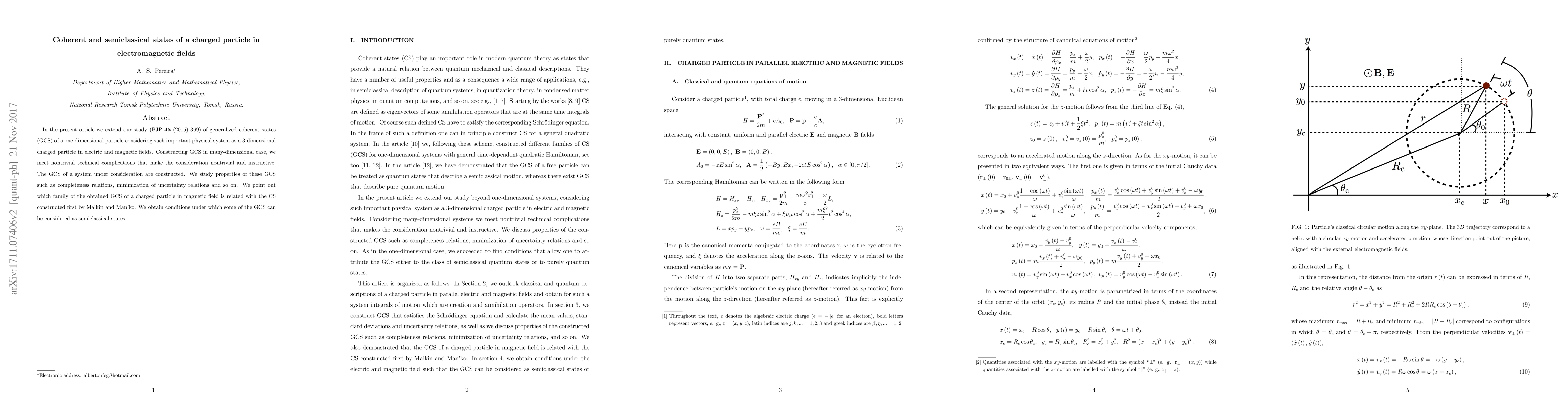 In the present article we extend our study (BJP 45 (2015) 369) of generalized coherent states (GCS) of a one-dimensional particle considering such important physical system as a 3-dimensional charged particle in electric and magnetic fields. Constructing GCS in many-dimensional case, we meet nontrivial technical complications that make the consideration nontrivial and instructive. The GCS of a system under consideration are constructed. We study properties of these GCS such as completeness relations, minimization of uncertainty relations and so on. We point out which family of the obtained GCS of a charged particle in magnetic field is related with the CS constructed first by Malkin and Man'ko. We obtain conditions under which some of the GCS can be considered as semiclassical states.