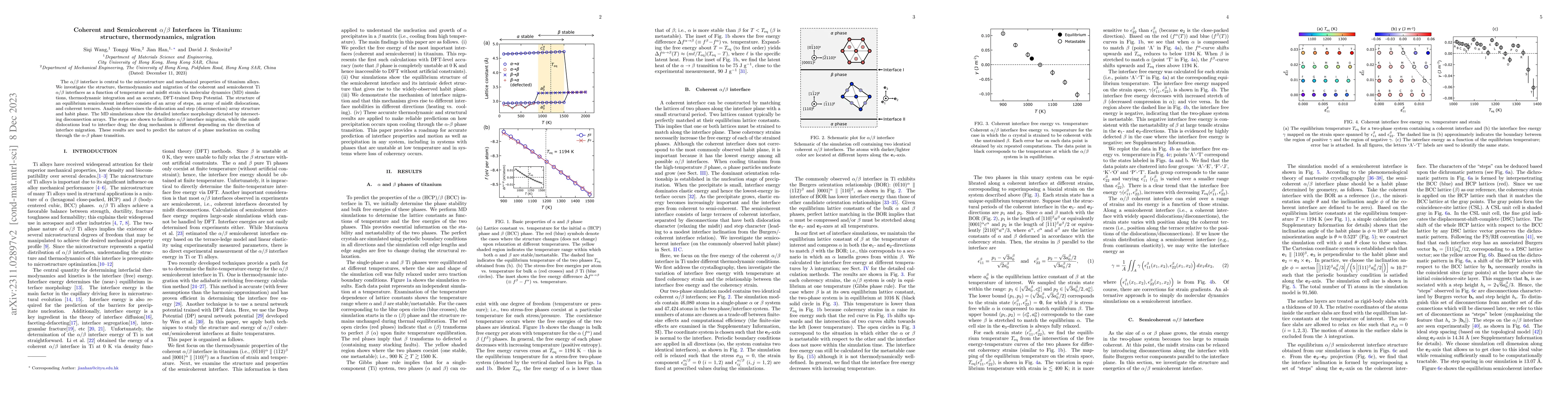The $\alpha/\beta$ interface is central to the microstructure and mechanical properties of titanium alloys. We investigate the structure, thermodynamics and migration of the coherent and semicoherent Ti $\alpha/\beta$ interfaces as a function of temperature and misfit strain via molecular dynamics (MD) simulations, thermodynamic integration and an accurate, DFT-trained Deep Potential. The structure of an equilibrium semicoherent interface consists of an array of steps, an array of misfit dislocations, and coherent terraces. Analysis determines the dislocation and step (disconnection) array structure and habit plane. The MD simulations show the detailed interface morphology dictated by intersecting disconnection arrays. The steps are shown to facilitate $\alpha/\beta$ interface migration, while the misfit dislocations lead to interface drag; the drag mechanism is different depending on the direction of interface migration. These results are used to predict the nature of $\alpha$ phase nucleation on cooling through the $\alpha$-$\beta$ phase transition.