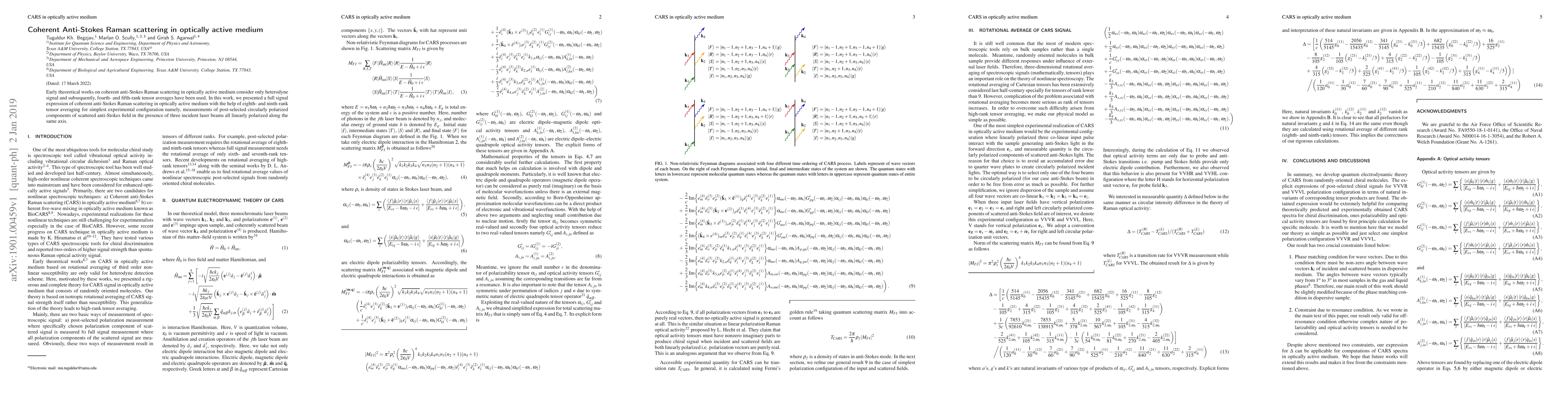 This paper presents a comprehensive signal expression for coherent anti-Stokes Raman scattering in optically active media, utilizing eighth- and ninth-rank tensor averaging for experimental setups involving three linearly polarized laser beams. It aims to go beyond previous heterodyne signal-focused theoretical works.