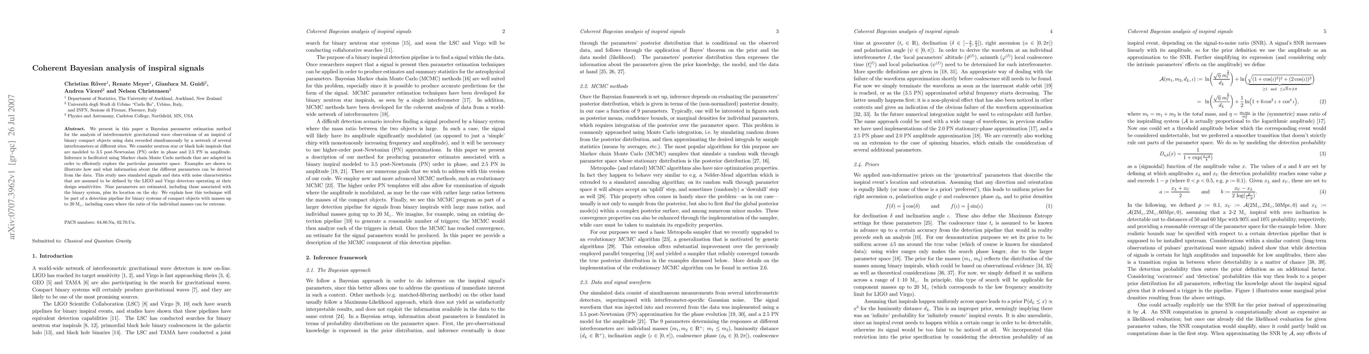 This paper introduces a Bayesian parameter estimation method for analyzing gravitational wave signals from binary compact object inspirals, employing advanced Markov chain Monte Carlo techniques to efficiently explore the parameter space. The method estimates nine parameters, including those related to the binary system's mass and sky location, and is designed for use in detection pipelines for systems up to 20 solar masses.