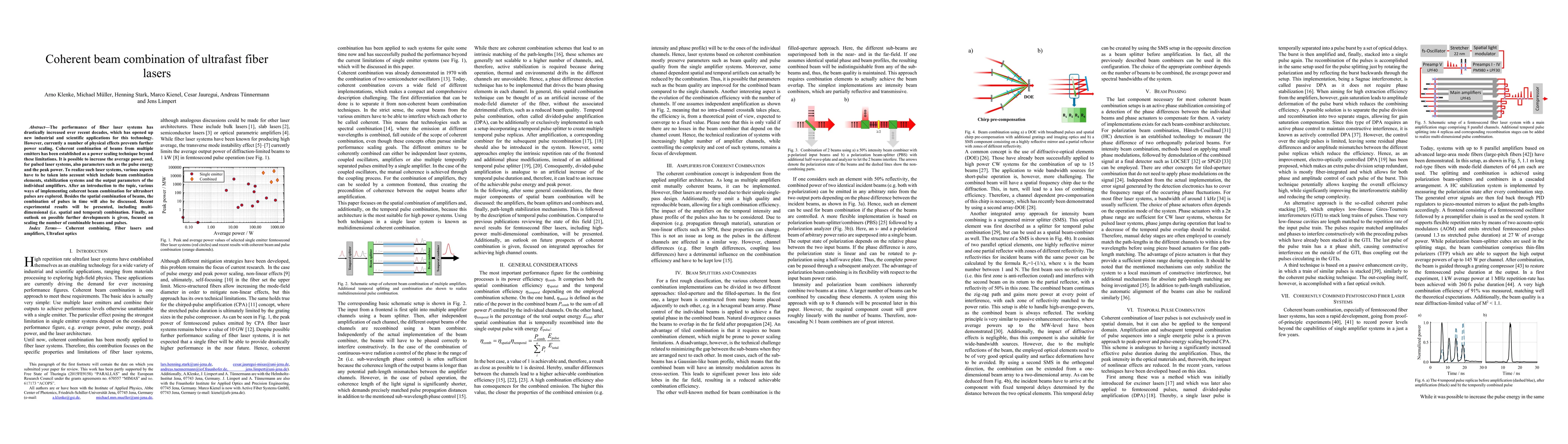 The performance of fiber laser systems has drastically increased over recent decades, which has opened up new industrial and scientific applications for this technology. However, currently a number of physical effects prevents further power scaling. Coherent combination of beams from multiple emitters has been established as a power scaling technique beyond these limitations. It is possible to increase the average power and, for pulsed laser systems, also parameters such as the pulse energy and the peak power. To realize such laser systems, various aspects have to be taken into account which include beam combination elements, stabilization systems and the output parameters of the individual amplifiers. After an introduction to the topic, various ways of implementing coherent beam combination for ultrashort pulses are explored. Besides the spatial combination of beams, the combination of pulses in time will also be discussed. Recent experimental results will be presented, including multi-dimensional (i.e. spatial and temporal) combination. Finally, an outlook on possible further developments is given, focused on scaling the number of combinable beams and pulses.