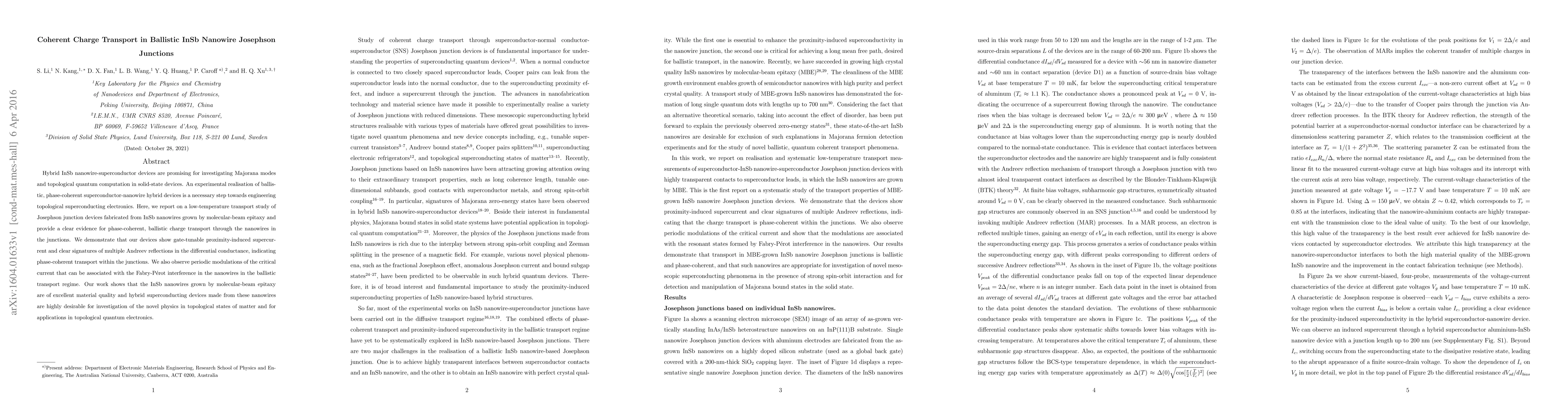 This study reports on low-temperature transport in ballistic InSb nanowire Josephson junctions, providing clear evidence of phase-coherent, ballistic charge transport and gate-tunable supercurrent, highlighting the potential of these devices for topological quantum computation.