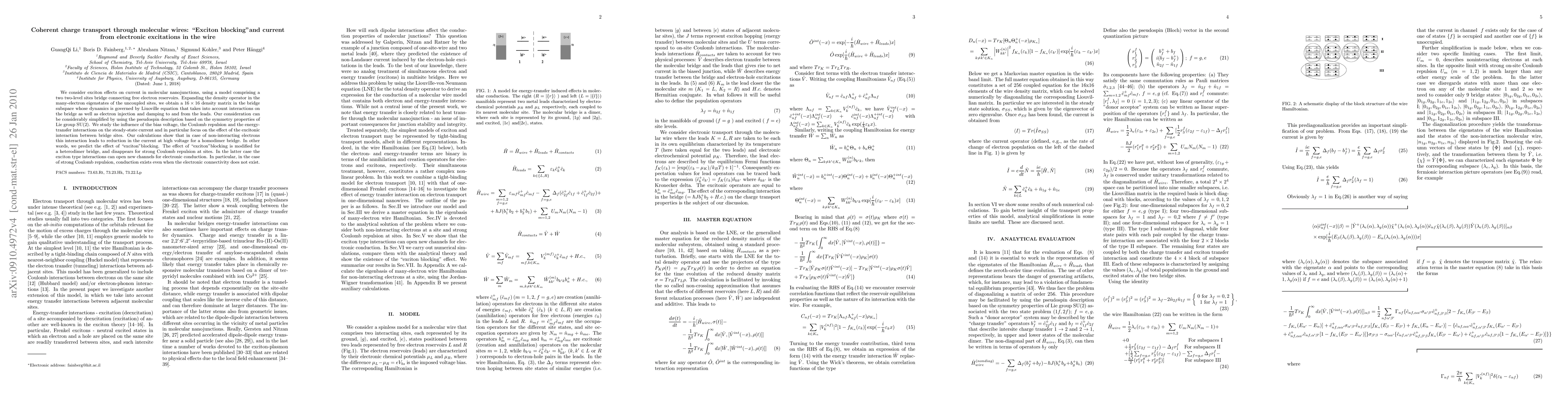 We consider exciton effects on current in molecular nanojunctions, using a model comprising a two two-level sites bridge connecting free electron reservoirs. Expanding the density operator in the many-electron eigenstates of the uncoupled sites, we obtain a 16X16 density matrix in the bridge subspace whose dynamics is governed by Liuoville equation that takes into account interactions on the bridge as well as electron injection and damping to and from the leads. Our consideration can be considerably simplified by using the pseudospin description based on the symmetry properties of Lie group SU(2). We study the influence of the bias voltage, the Coulomb repulsion and the energy-transfer interactions on the steady-state current and in particular focus on the effect of the excitonic interaction between bridge sites. Our calculations show that in case of non-interacting electrons this interaction leads to reduction in the current at high voltage for a homodimer bridge. In other words, we predict the effect of \textquotedblleft exciton\textquotedblright blocking. The effect of \textquotedblleft exciton\textquotedblright blocking is modified for a heterodimer bridge, and disappears for strong Coulomb repulsion at sites. In the latter case the exciton type interactions can open new channels for electronic conduction. In particular, in the case of strong Coulomb repulsion, conduction exists even when the electronic connectivity does not exist.