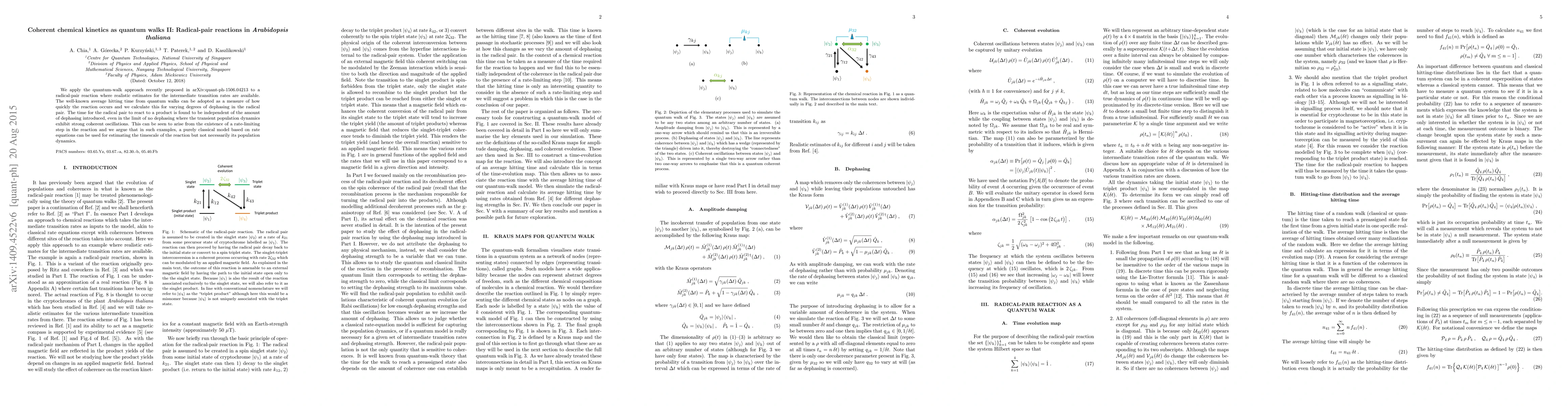 This paper applies a quantum-walk approach to radical-pair reactions in Arabidopsis thaliana, finding that reaction time is independent of dephasing, due to a rate-limiting step. Classical models can estimate reaction timescales but not population dynamics.