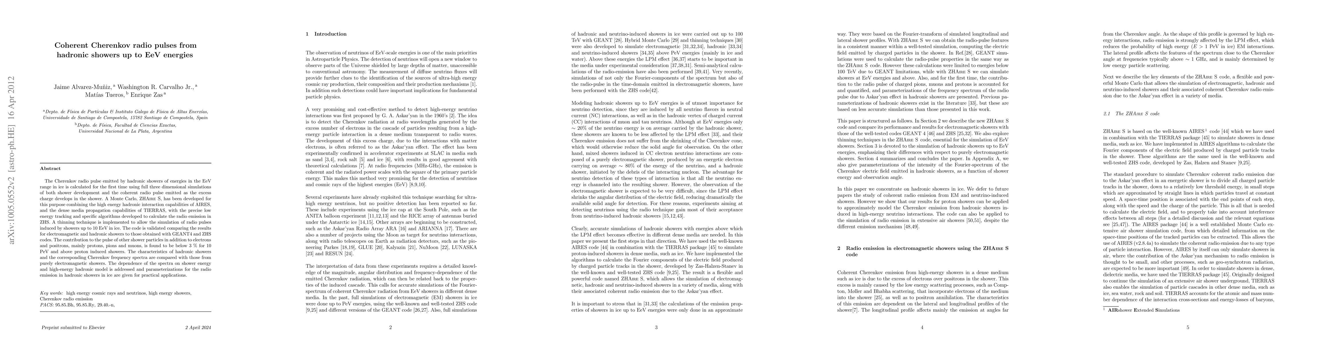 The Cherenkov radio pulse emitted by hadronic showers in ice is calculated for showers of energies in the EeV range. This is obtained with three dimensional simulations of both shower development and the coherent radio pulse emitted as the excess charge develops in the shower. A Monte Carlo, ZHAireS, has been developed for this purpose combining the high energy hadronic interaction capabilities of AIRES, and the dense media propagation capabilities of TIERRAS, with the precise low energy tracking and specific algorithms developed to calculate the radio emission in ZHS. A thinning technique is implemented and optimized to allow the simulation of radio pulses induced by showers up to 10 EeV in ice. The code is validated comparing the results for electromagnetic and hadronic showers to those obtained with GEANT4 and ZHS codes. The contribution to the pulse of other shower particles in addition to electrons and positrons, mainly pions and muons, is found to be below 1%. The characteristics of hadronic showers and the corresponding Cherenkov frequency spectra are compared with those from purely electromagnetic showers. The dependence of the spectra on shower energy and high-energy hadronic model is addressed and parameterizations for the radio emission in hadronic showers in ice are given for practical applications.