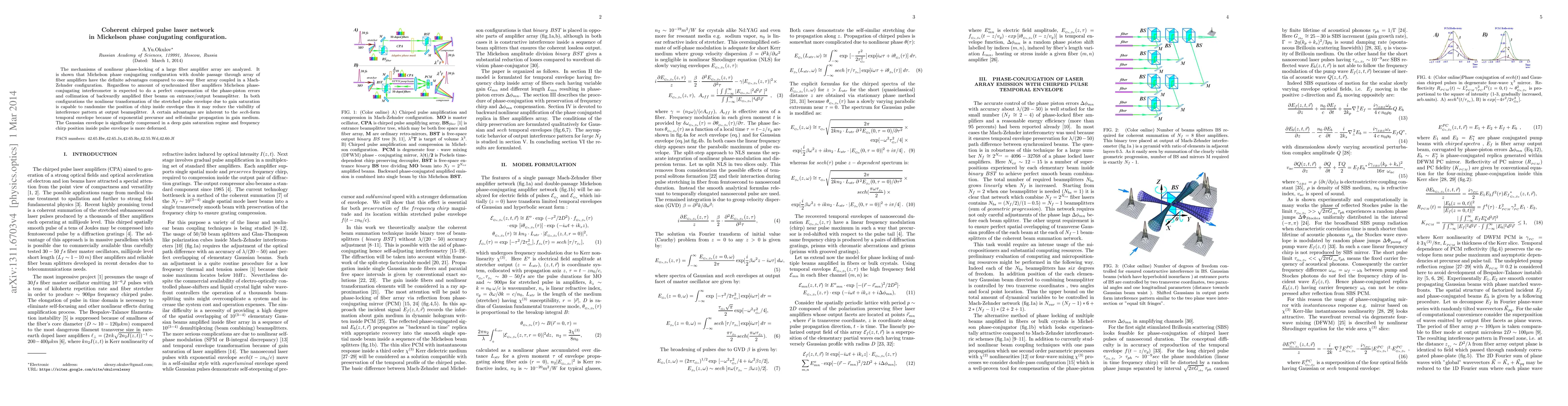 The mechanisms of nonlinear phase-locking of a large fiber amplifier array are analyzed. It is shown that Michelson phase conjugating configuration with double passage through array of fiber amplifiers have the definite advantages compared to one-way fiber array coupled in a Mach-Zehnder configuration. Regardless to amount of synchronized fiber amplifiers Michelson phase-conjugating interferometer is expected to do a perfect compensation of the phase-piston errors and collimation of backwardly amplified fiber beams on entrance/output beamsplitter. In both configurations the nonlinear transformation of the stretched pulse envelope due to gain saturation is capable to randomize the position of chirp inside envelope thus it may reduce the visibility of interference pattern at output beamsplitter. A certain advantages are inherent to the $sech$-form temporal envelope because of exponential precursor and self-similar propagation in gain medium. The Gaussian envelope is significantly compressed in a deep gain saturation regime and frequency chirp position inside pulse envelope is more deformed.