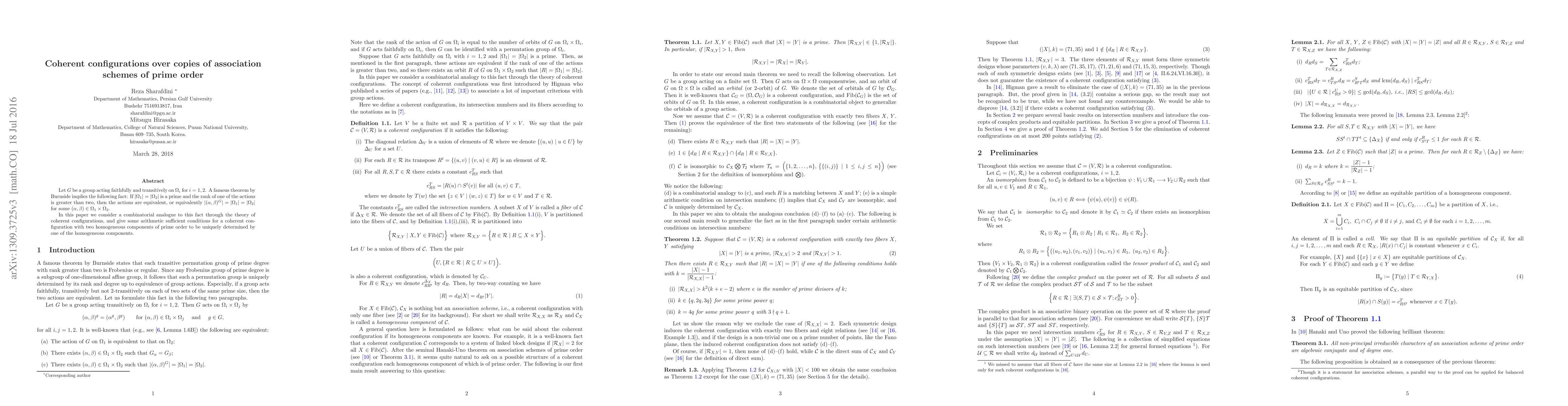 Let $G$ be a group acting faithfully and transitively on $\Omega_i$ for $i=1,2$. A famous theorem by Burnside implies the following fact: If $|\Omega_1|=|\Omega_2|$ is a prime and the rank of one of the actions is greater than two, then the actions are equivalent, or equivalently $|(\alpha,\beta)^G|=|\Omega_1|=|\Omega_2|$ for some $(\alpha,\beta)\in \Omega_1\times \Omega_2$. In this paper we consider a combinatorial analogue to this fact through the theory of coherent configurations, and give some arithmetic sufficient conditions for a coherent configuration with two homogeneous components of prime order to be uniquely determined by one of the homogeneous components.