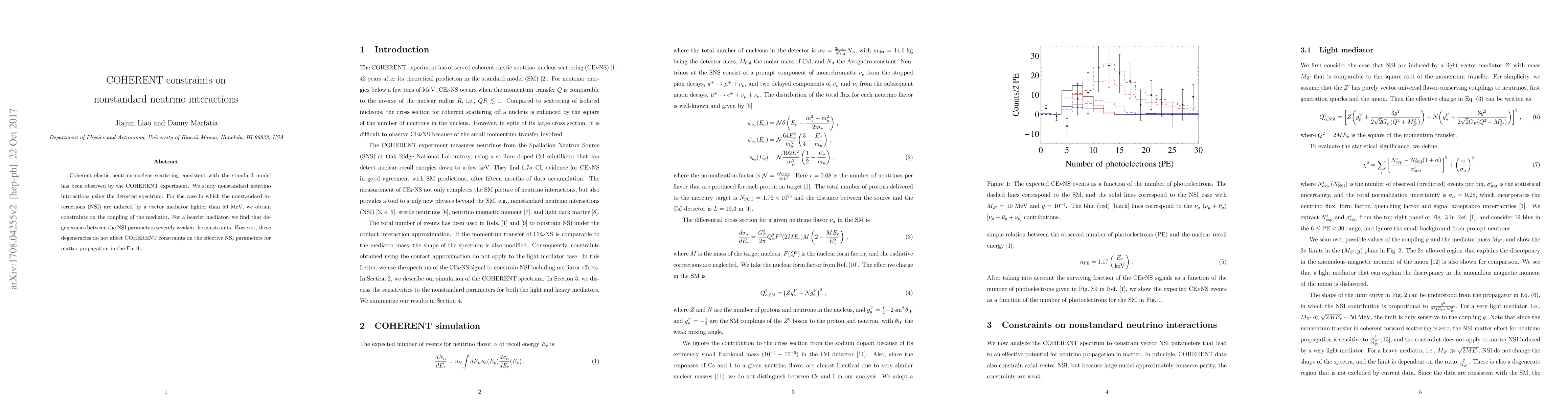 The COHERENT experiment observed coherent elastic neutrino-nucleus scattering, confirming the standard model. The study sets constraints on nonstandard neutrino interactions, particularly for vector mediators lighter than 50 MeV, while noting that heavier mediators lead to weakened constraints due to parameter degeneracies, except for Earth matter propagation NSI parameters.