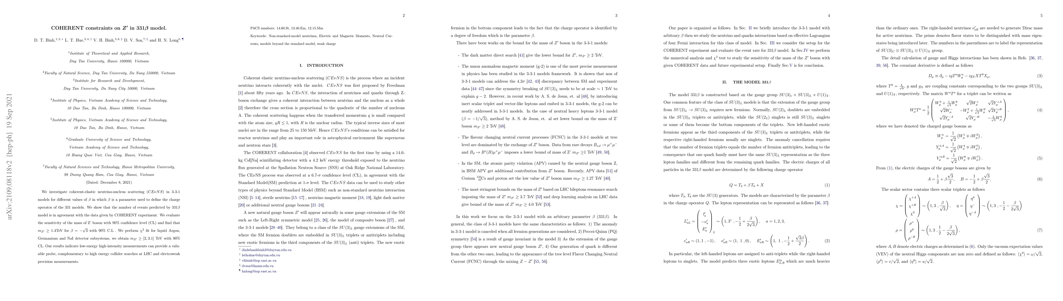 A 3-3-1 model predicts coherent-elastic neutrino-nucleus scattering data from the COHERENT experiment, setting a lower bound on the mass of Z' boson at 1.4 TeV.