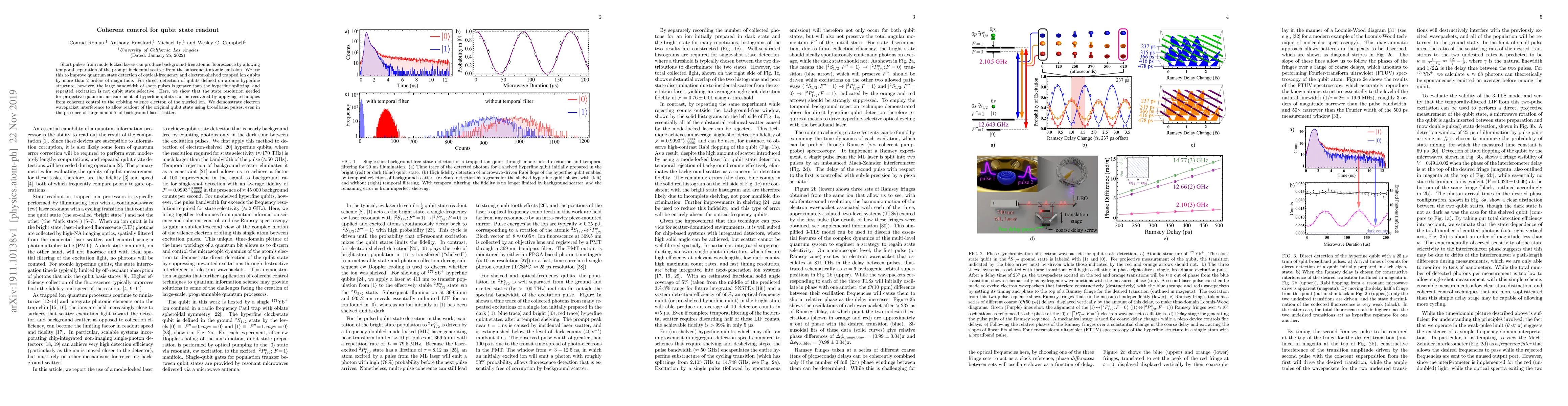 Short pulses from mode-locked lasers can produce background-free atomic fluorescence by allowing temporal separation of the prompt incidental scatter from the subsequent atomic emission. We use this to improve quantum state detection of optical-frequency and electron-shelved trapped ion qubits by more than 2 orders of magnitude. For direct detection of qubits defined on atomic hyperfine structure, however, the large bandwidth of short pulses is greater than the hyperfine splitting, and repeated excitation is not qubit state selective. Here, we show that the state resolution needed for projective quantum measurement of hyperfine qubits can be recovered by applying techniques from coherent control to the orbiting valence electron of the queried ion. We demonstrate electron wavepacket interference to allow readout of the original qubit state using broadband pulses, even in the presence of large amounts of background laser scatter.