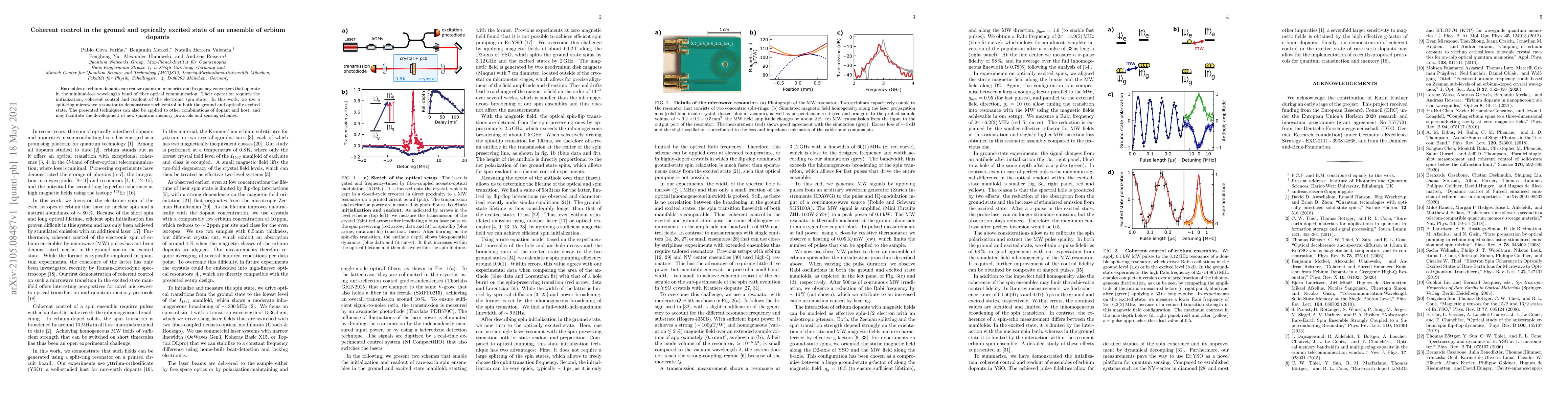 Ensembles of erbium dopants can realize quantum memories and frequency converters that operate in the minimal-loss wavelength band of fiber optical communication. Their operation requires the initialization, coherent control and readout of the electronic spin state. In this work, we use a split-ring microwave resonator to demonstrate such control in both the ground and optically excited state. The presented techniques can also be applied to other combinations of dopant and host, and may facilitate the development of new quantum memory protocols and sensing schemes.