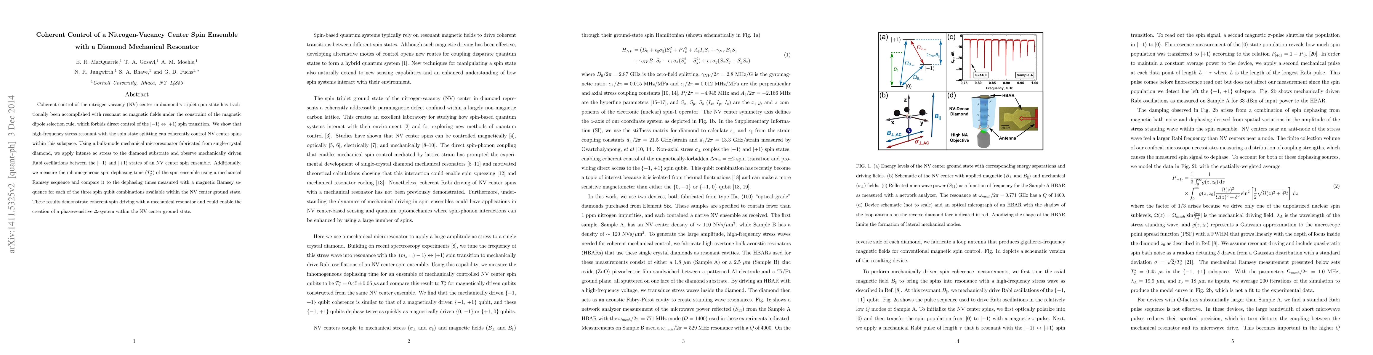 This paper demonstrates coherent control of nitrogen-vacancy center spins in a diamond mechanical resonator using high-frequency stress, enabling Rabi oscillations between the $|-1>$ and $|+1>$ states. It also measures the inhomogeneous spin dephasing time $T_{2}^{*}$ using a mechanical Ramsey sequence and compares it to magnetic methods.