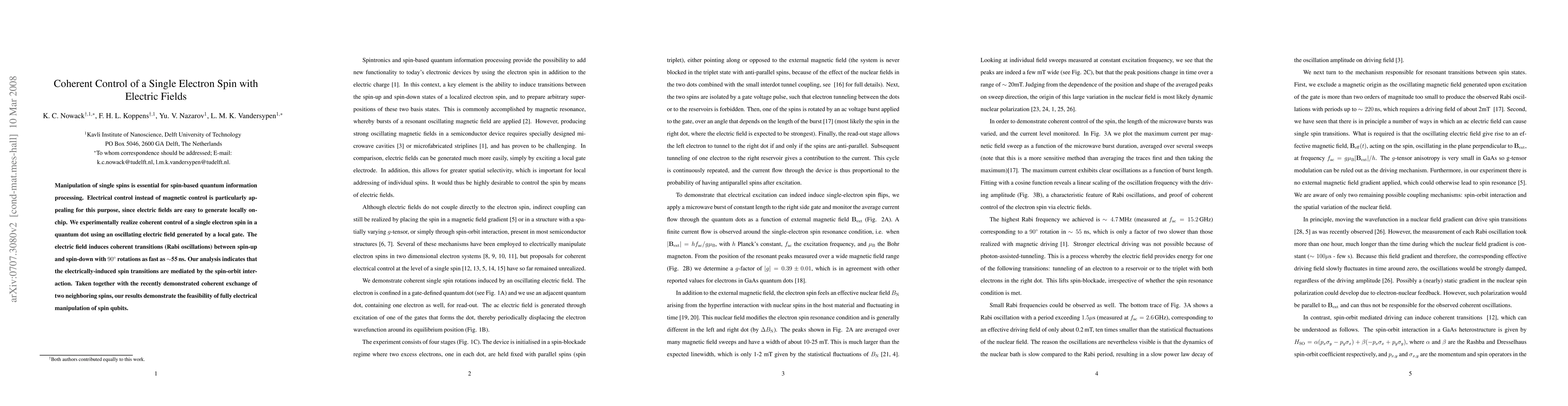 This paper demonstrates the coherent control of a single electron spin in a quantum dot using an oscillating electric field from a local gate, achieving pi/2 rotations in ~55ns. The spin transitions are mediated by the spin-orbit interaction, showcasing the potential for fully electrical manipulation of spin qubits in quantum information processing.