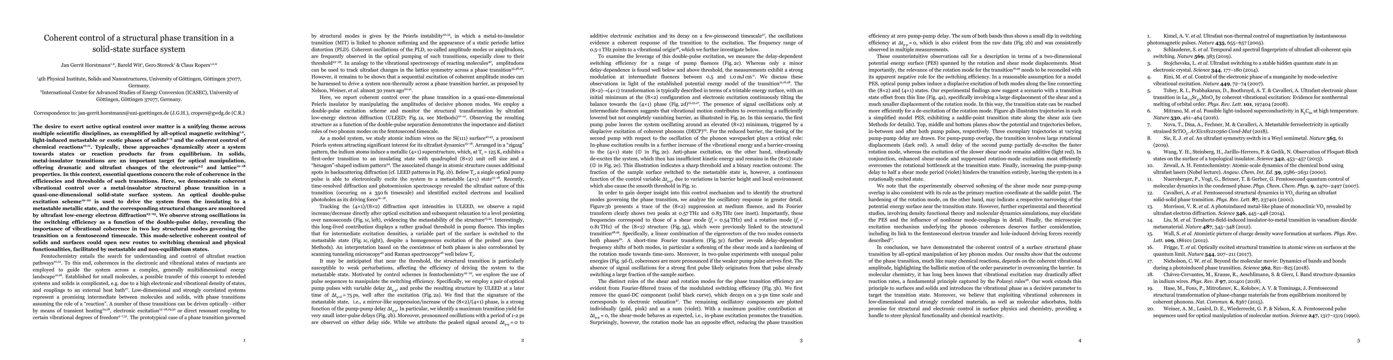 This paper demonstrates coherent control of a metal-insulator phase transition in a solid-state surface system using an optical double-pulse excitation, revealing the role of vibrational coherence in the transition efficiency. The study highlights the potential for manipulating structural and electronic properties through mode-selective control.