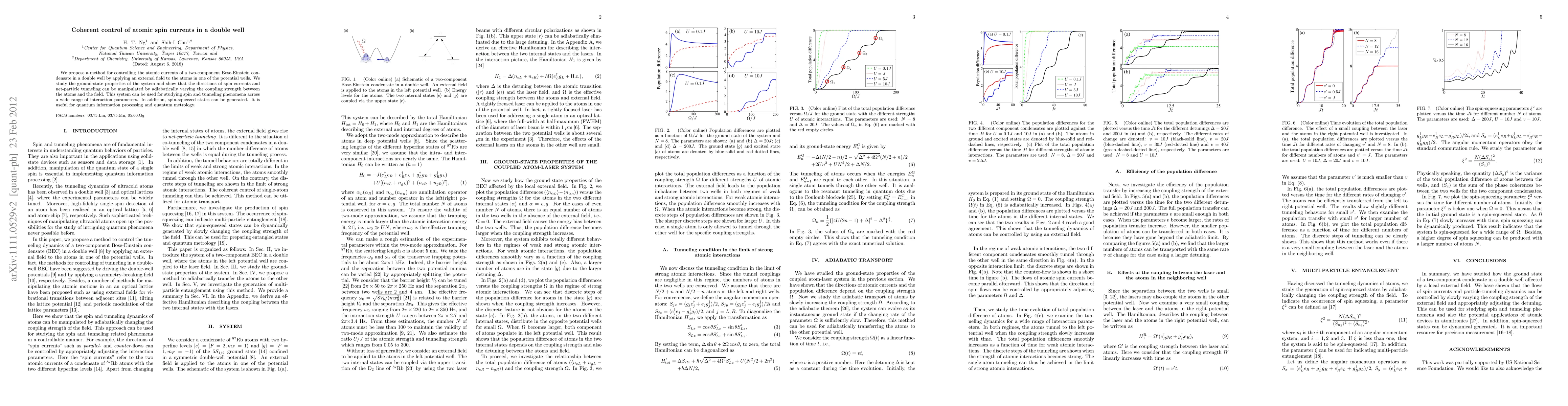 This paper proposes a method to control atomic spin currents in a double well using an external field, demonstrating manipulation of spin currents and tunneling through adiabatic coupling strength variation. The technique is useful for quantum information processing and quantum metrology.