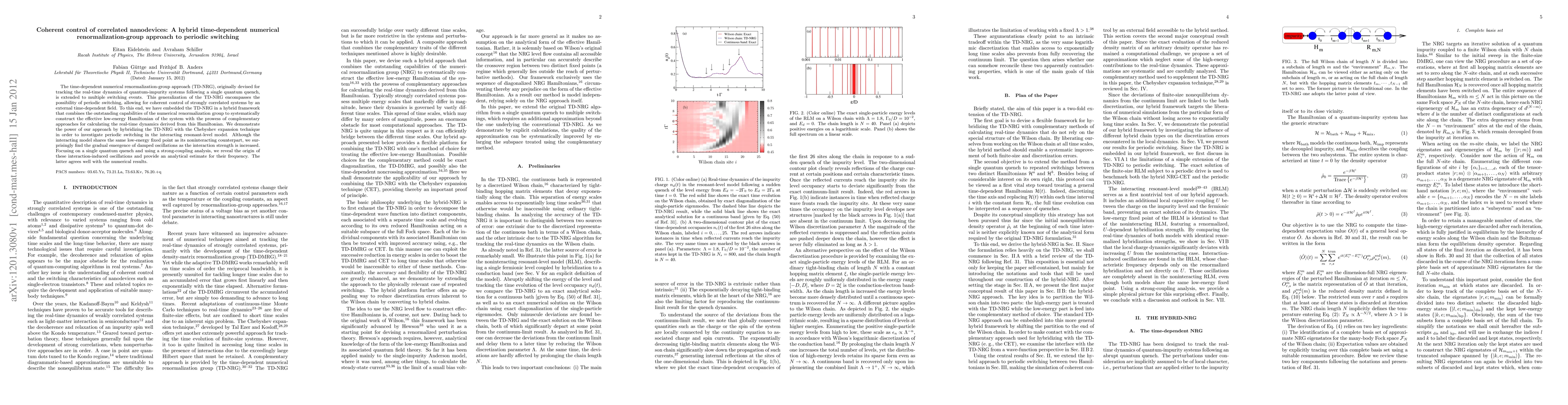 The time-dependent numerical renormalization-group approach (TD-NRG), originally devised for tracking the real-time dynamics of quantum-impurity systems following a single quantum quench, is extended to multiple switching events. This generalization of the TD-NRG encompasses the possibility of periodic switching, allowing for coherent control of strongly correlated systems by an external time-dependent field. To this end, we have embedded the TD-NRG in a hybrid framework that combines the outstanding capabilities of the numerical renormalization group to systematically construct the effective low-energy Hamiltonian of the system with the prowess of complementary approaches for calculating the real-time dynamics derived from this Hamiltonian. We demonstrate the power of our approach by hybridizing the TD-NRG with the Chebyshev expansion technique in order to investigate periodic switching in the interacting resonant-level model. Although the interacting model shares the same low-energy fixed point as its noninteracting counterpart, we surprisingly find the gradual emergence of damped oscillations as the interaction strength is increased. Focusing on a single quantum quench and using a strong-coupling analysis, we reveal the origin of these interaction-induced oscillations and provide an analytical estimate for their frequency. The latter agrees well with the numerical results.