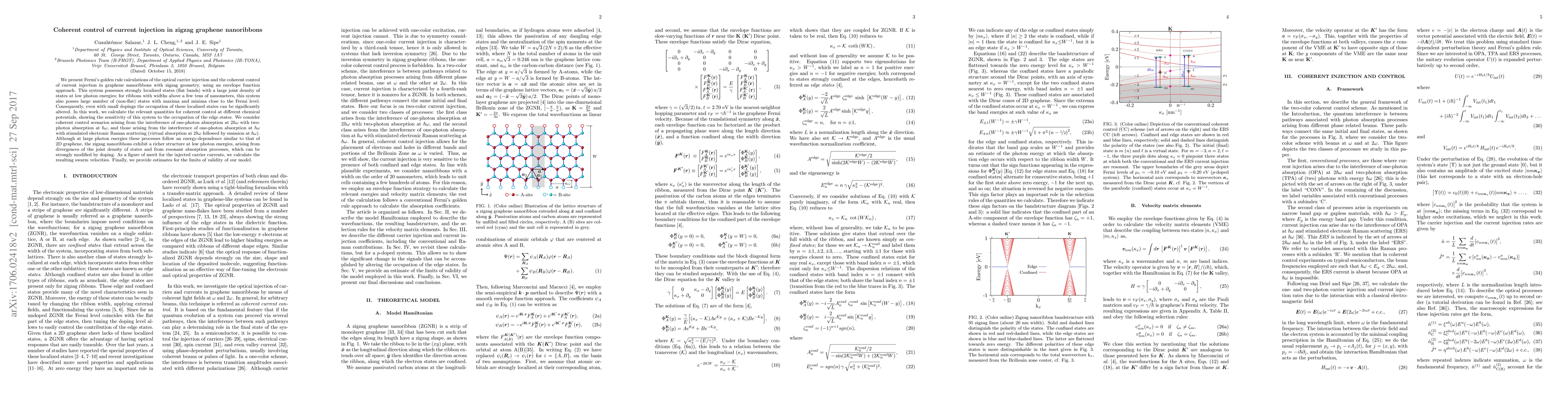 This research investigates the coherent control of current injection in zigzag graphene nanoribbons using optical carrier injection, revealing that localized states and edge states significantly influence the system's behavior. The study calculates relevant quantities at various chemical potentials, showing how doping affects these states and the resulting swarm velocities, while highlighting the unique properties of these nanoribbons compared to bulk graphene.
