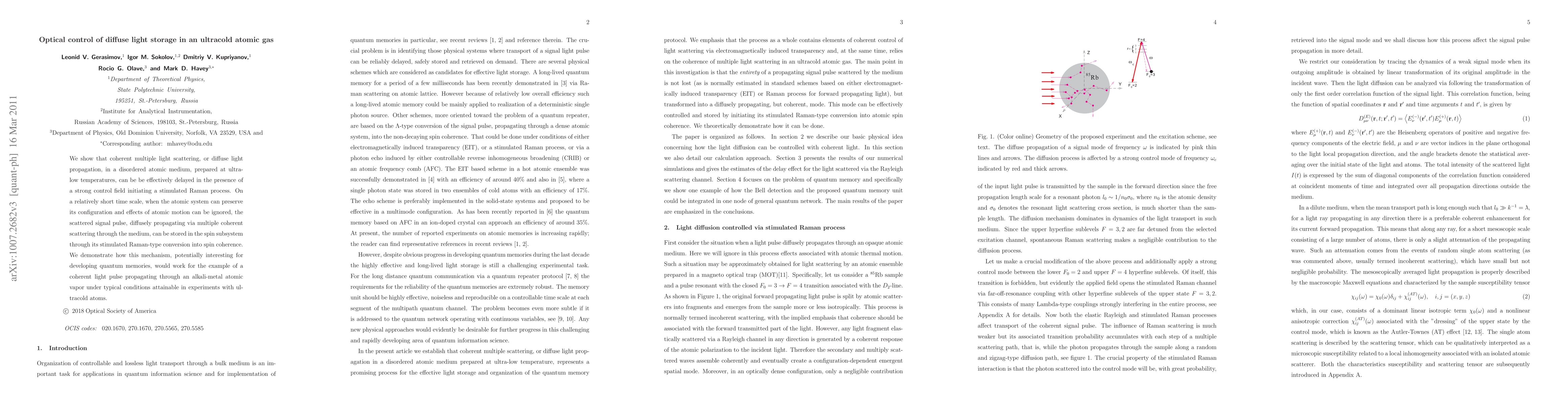 This paper demonstrates the coherent control of diffuse light dynamics in an ultracold atomic gas by using a strong control field to delay multiple light scattering. The scattered light pulse can be stored in the spin subsystem via stimulated Raman processes, presenting a potential pathway for developing quantum memories.
