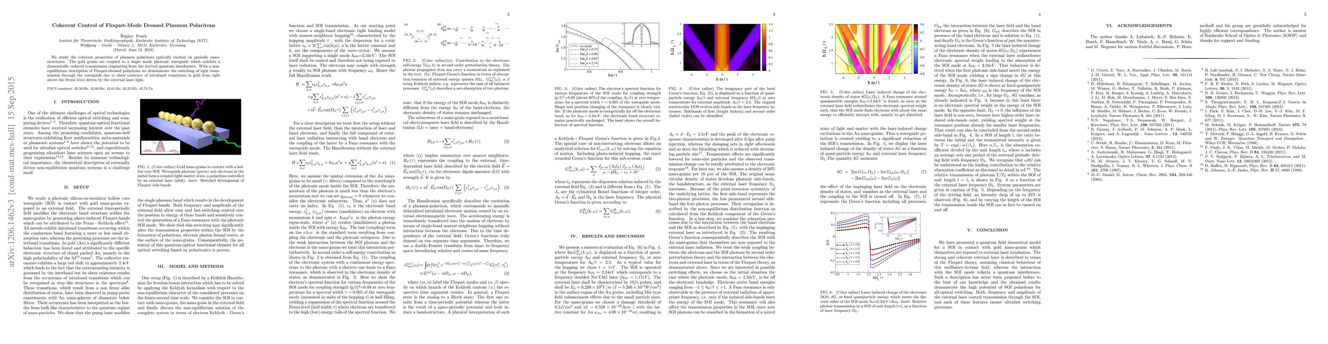 The paper presents a quantum field theoretical model for a SOI with gold nano-grains under external laser irradiation, describing the system using Floquet theory and demonstrating coherent control of plasmon polaritons for all-optical switching.