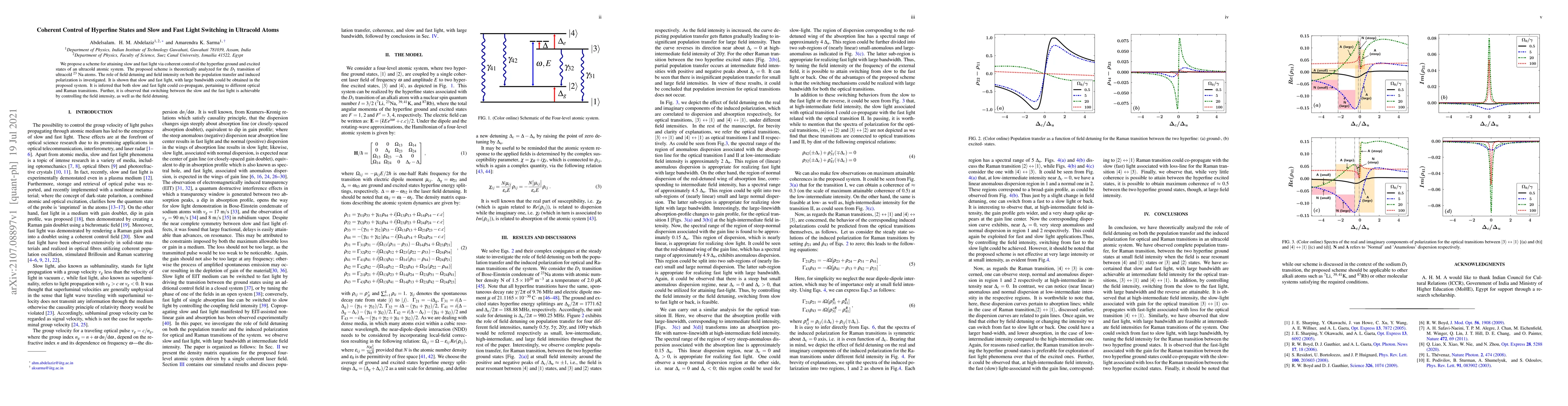 This paper proposes a method to achieve slow and fast light through coherent control of hyperfine states in ultracold $^{23}$Na atoms, analyzing the $D_1$ transition. The study investigates the effects of field detuning and intensity on population transfer and polarization, demonstrating the potential for large bandwidth and co-propagation of slow and fast light via different optical and Raman transitions, with switching controlled by field parameters.