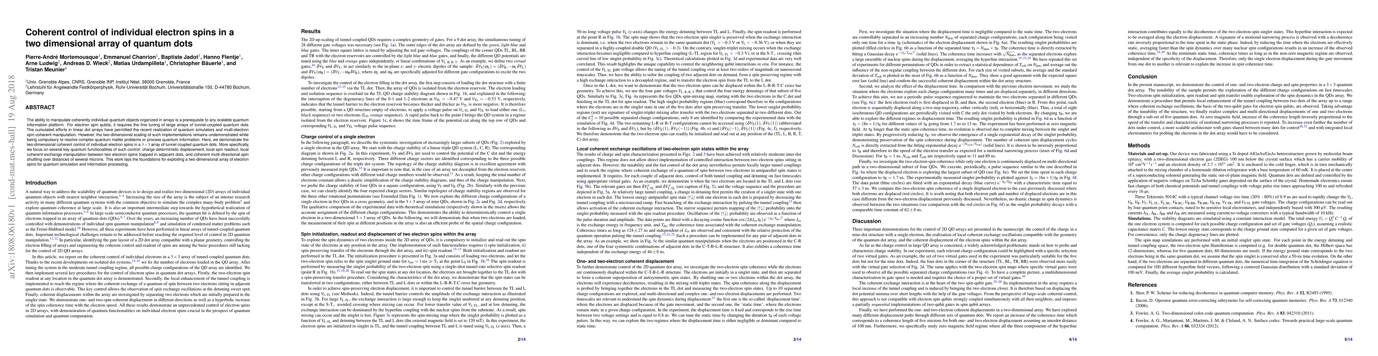 This paper demonstrates the coherent control of individual electron spins in a 3x3 array of tunnel-coupled quantum dots, showcasing charge manipulation, local spin readout, coherent exchange interactions, and multi-directional spin shuttling, which are foundational for scalable quantum information processing platforms.