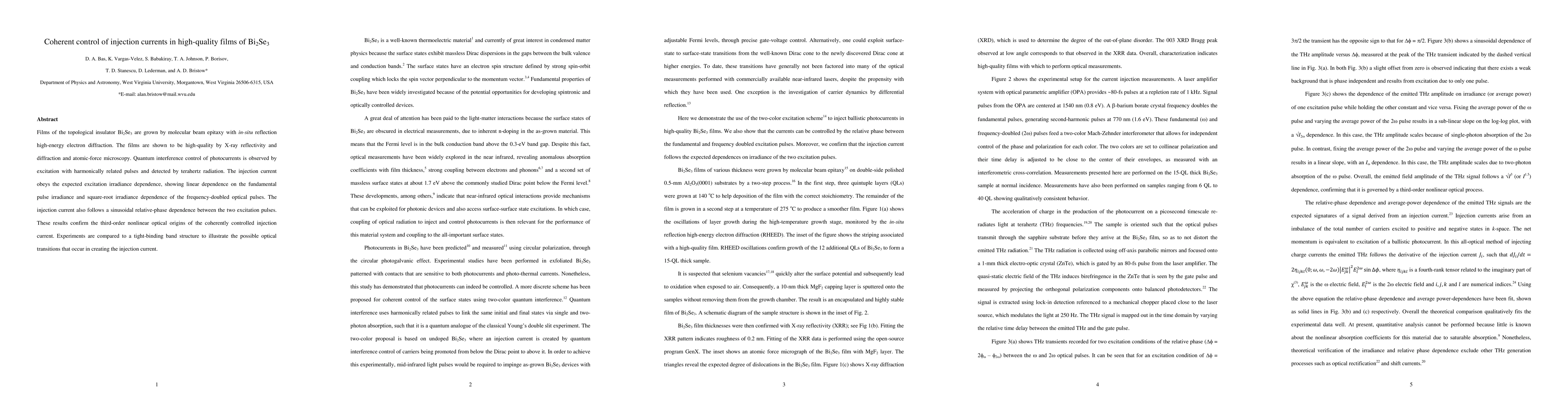 Films of the topological insulator Bi2Se3 are grown by molecular beam epitaxy with in-situ reflection high-energy electron diffraction. The films are shown to be high-quality by X-ray reflectivity and diffraction and atomic-force microscopy. Quantum interference control of photocurrents is observed by excitation with harmonically related pulses and detected by terahertz radiation. The injection current obeys the expected excitation irradiance dependence, showing linear dependence on the fundamental pulse irradiance and square-root irradiance dependence of the frequency-doubled optical pulses. The injection current also follows a sinusoidal relative-phase dependence between the two excitation pulses. These results confirm the third-order nonlinear optical origins of the coherently controlled injection current. Experiments are compared to a tight-binding band structure to illustrate the possible optical transitions that occur in creating the injection current.