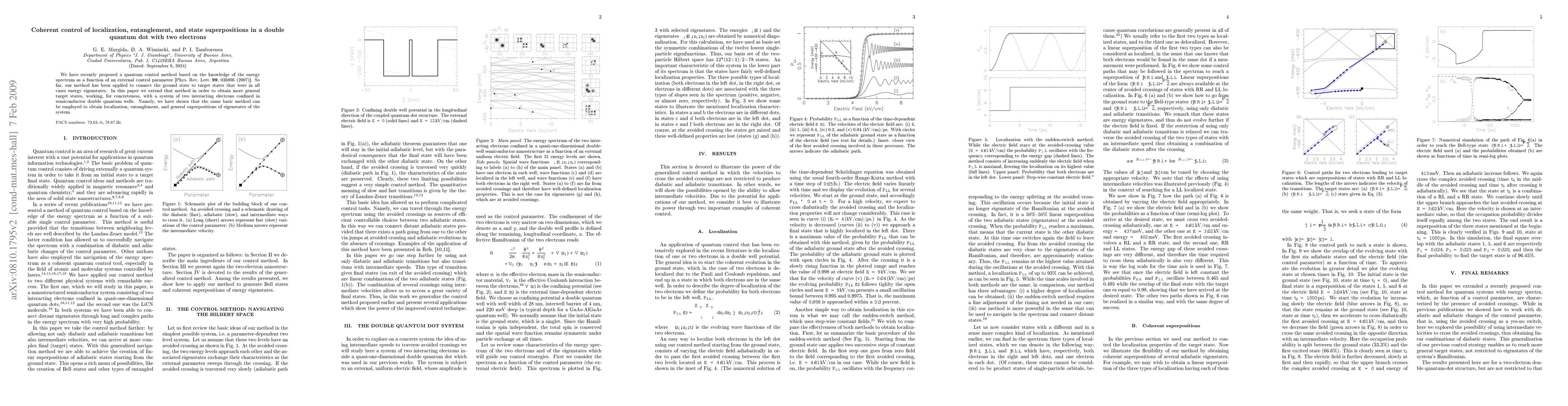 We have recently proposed a quantum control method based on the knowledge of the energy spectrum as a function of an external control parameter [Phys. Rev. Lett. {\bf 99}, 036806 (2007)]. So far, our method has been applied to connect the ground state to target states that were in all cases energy eigenstates. In this paper we extend that method in order to obtain more general target states, working, for concreteness, with a system of two interacting electrons confined in semiconductor double quantum wells. Namely, we have shown that the same basic method can be employed to obtain localization, entanglement, and general superpositions of eigenstates of the system.