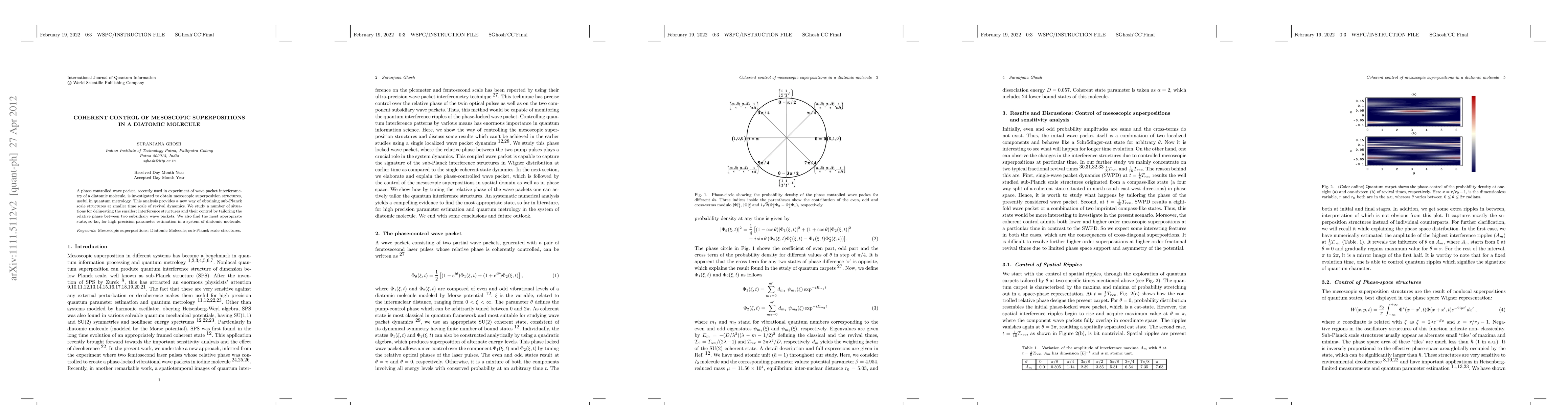 A phase controlled wave packet, recently used in experiment of wave packet interferometry of adiatomic molecule, is investigated to obtain mesoscopic superposition structures, useful in quantum metrology. This analysis provides a new way of obtaining sub-Planck scale structures at smaller time scale of revival dynamics. We study a number of situations for delineating the smallest interference structures and their control by tailoring the relative phase between two subsidiary wave packets. We also find the most appropriate state, so far, for high precision parameter estimation in a system of diatomic molecule.