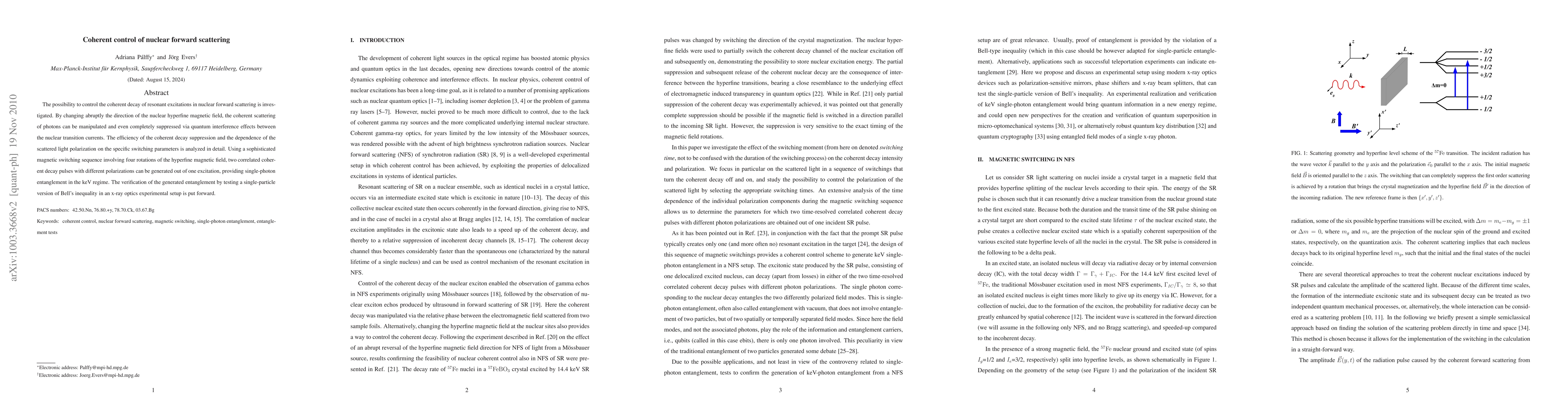 This paper investigates the coherent control of nuclear forward scattering by manipulating the decay of resonant excitations through abrupt changes in the nuclear hyperfine magnetic field, achieving complete suppression via quantum interference. A magnetic switching sequence generates entangled single-photon pairs in the keV regime, verified by testing a single-particle version of Bell's inequality in an x-ray optics setup.