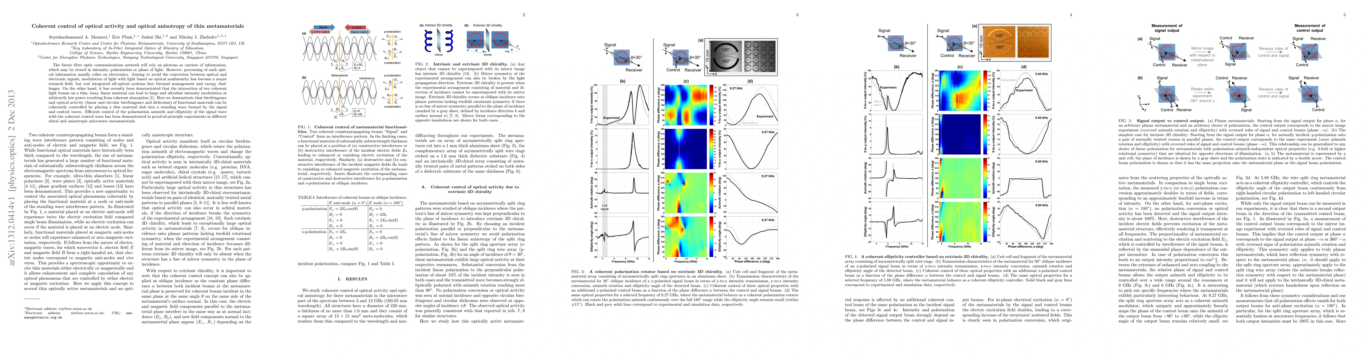 This paper demonstrates the coherent control of optical activity and anisotropy in thin metamaterials using a standing wave formed by signal and control light beams, enabling efficient modulation of light polarization without electronic conversion, addressing challenges in integrated all-optical systems. Experiments show successful control of birefringence and optical activity in chiral and anisotropic microwave metamaterials.