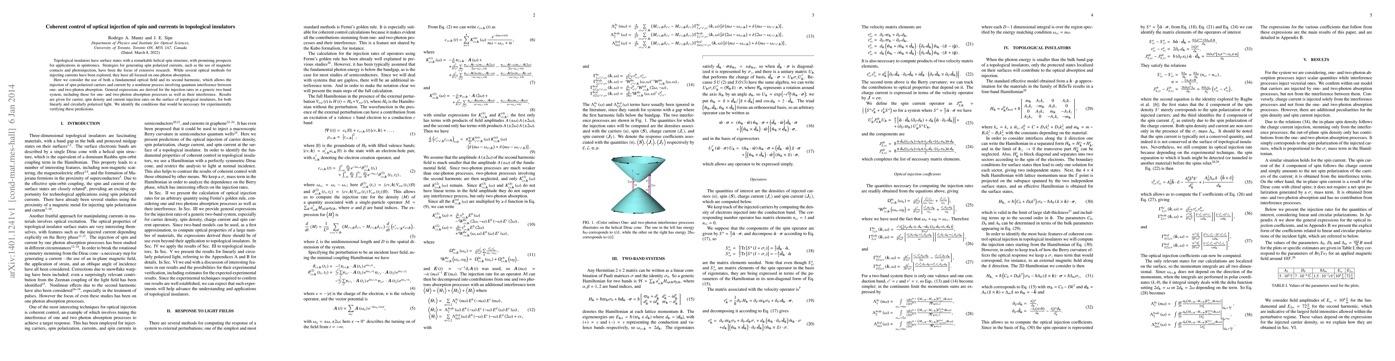 This paper explores the coherent control of spin and current injection in topological insulators using both fundamental and second harmonic optical fields, leveraging quantum interference between one- and two-photon absorption processes. The study derives expressions for injection rates and identifies conditions for experimental verification.