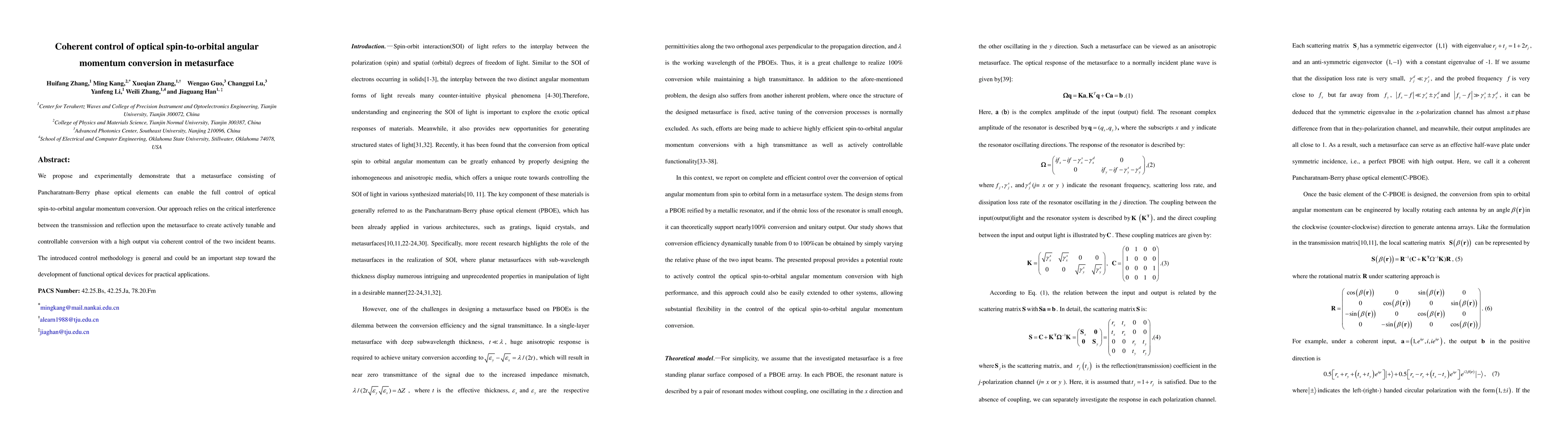 This paper proposes and demonstrates a metasurface using Pancharatnam-Berry phase elements to fully control optical spin-to-orbital angular momentum conversion through coherent interference of transmission and reflection, offering a general methodology for practical optical device development.