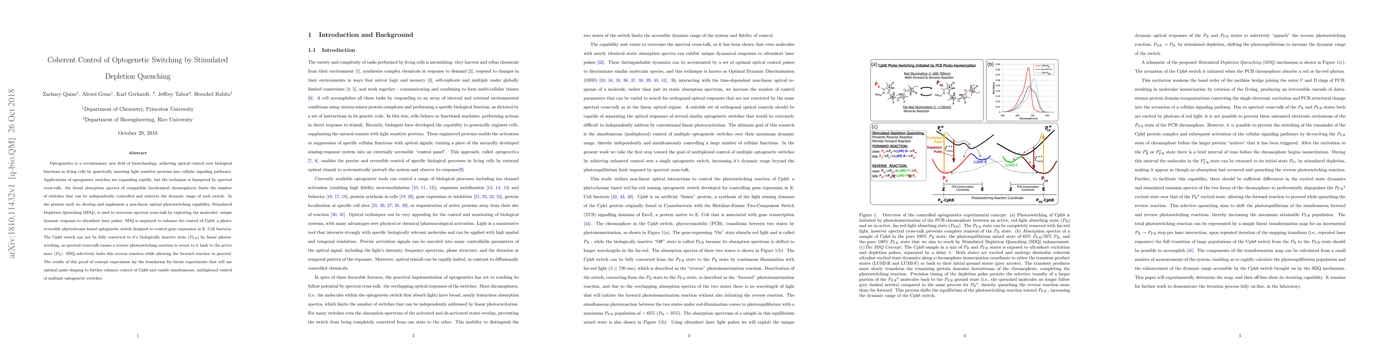 Optogenetics is a revolutionary new field of biotechnology, achieving optical control over biological functions in living cells by genetically inserting light sensitive proteins into cellular signaling pathways. Applications of optogenetic switches are expanding rapidly, but the technique is hampered by spectral cross-talk: the broad absorption spectra of compatible biochemical chromophores limits the number of switches that can be independently controlled and restricts the dynamic range of each switch. In the present work we develop and implement a non-linear optical photoswitching capability, Stimulated Depletion Quenching (SDQ), is used to overcome spectral cross-talk by exploiting the molecules' unique dynamic response to ultrashort laser pulses. SDQ is employed to enhance the control of Cph8, a photo-reversible phytochrome based optogenetic switch designed to control gene expression in E. Coli bacteria. The Cph8 switch can not be fully converted to it's biologically inactive state ($P_{FR}$) by linear photos-witching, as spectral cross-talk causes a reverse photoswitching reaction to revert to it back to the active state ($P_{R}$). SDQ selectively halts this reverse reaction while allowing the forward reaction to proceed. The results of this proof of concept experiment lay the foundation for future experiments that will use optimal pulse shaping to further enhance control of Cph8 and enable simultaneous, multiplexed control of multiple optogenetic switches.