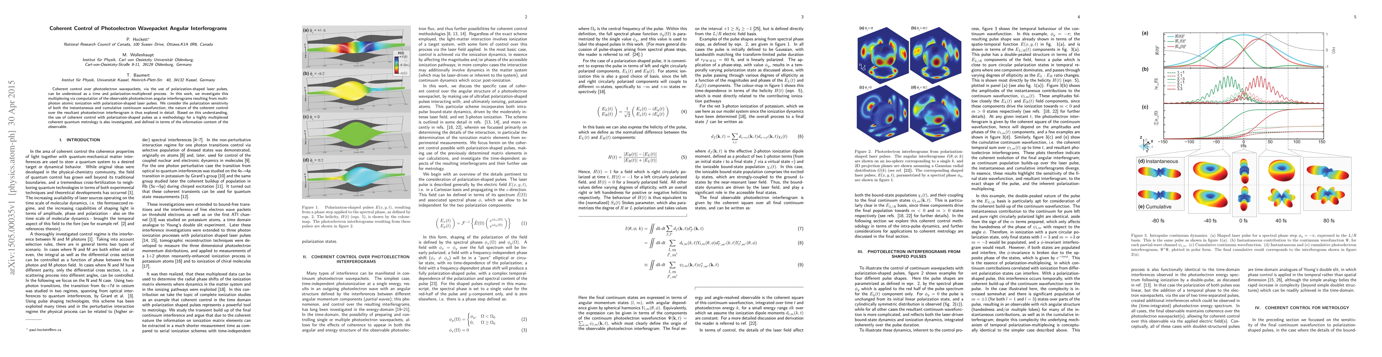 This paper explores coherent control of photoelectron wavepackets using polarization-shaped laser pulses to manipulate multi-photon ionization processes. It investigates the resulting photoelectron angular interferograms and their polarization sensitivity, proposing this technique as a method for advanced quantum metrology.