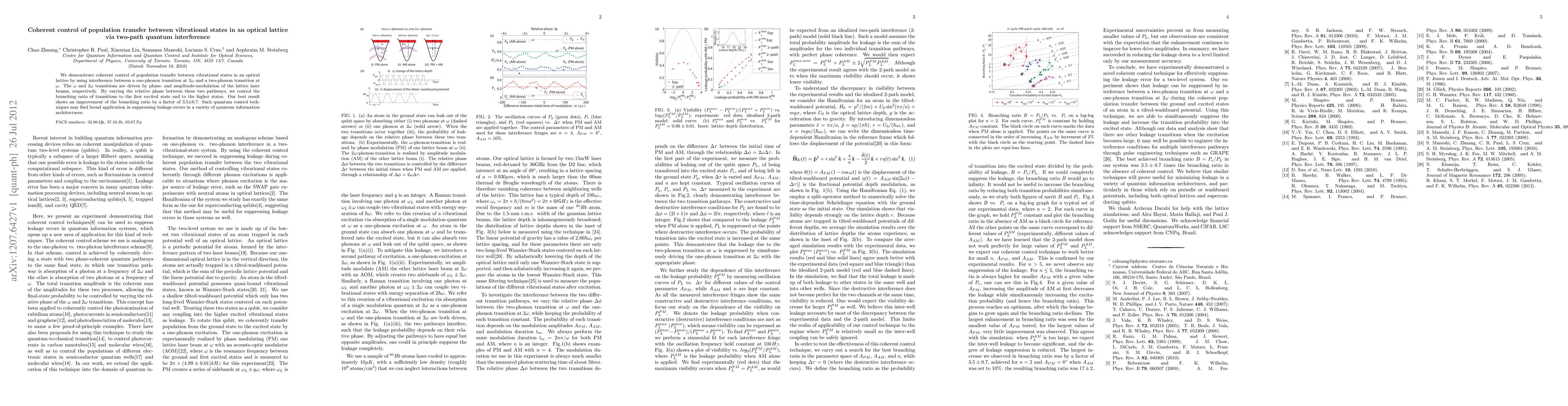 This paper demonstrates coherent control over population transfer between vibrational states in an optical lattice through quantum interference between a one-phonon and a two-phonon transition. By modulating the lattice laser beams, the branching ratio of transitions is controlled, achieving an improvement of up to a factor of 3.5±0.7, which could enhance quantum information processing by reducing leakage errors.