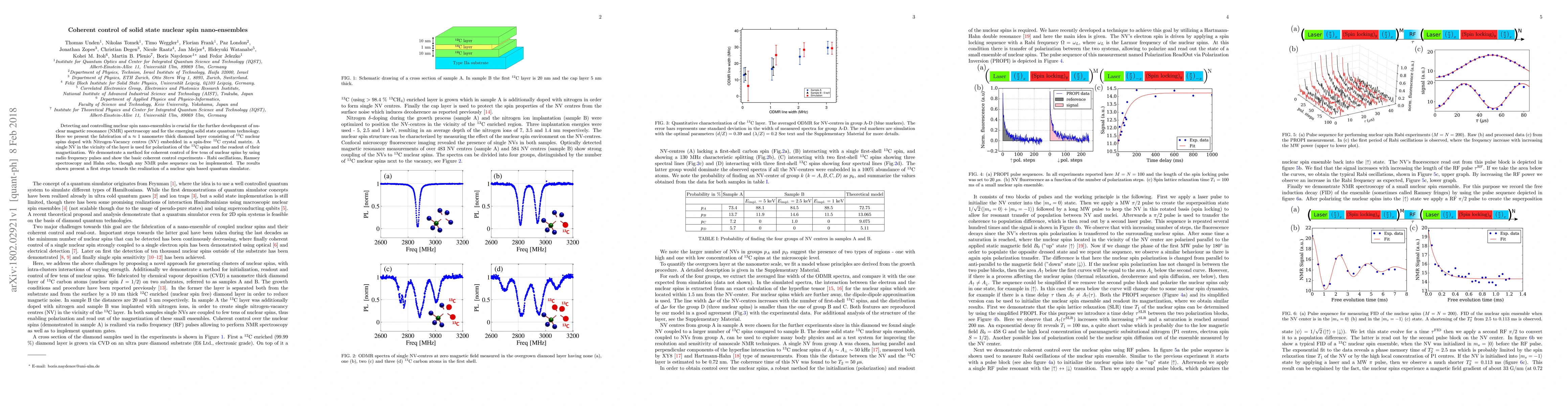 Detecting and controlling nuclear spin nano-ensembles is crucial for the further development of nuclear magnetic resonance (NMR) spectroscopy and for the emerging solid state quantum technology. Here we present the fabrication of a $\approx$ 1 nanometre thick diamond layer consisting of $^{13}$C nuclear spins doped with Nitrogen-Vacancy centres (NV) embedded in a spin-free $^{12}$C crystal matrix. A single NV in the vicinity of the layer is used for polarization of the $^{13}$C spins and the readout of their magnetization. We demonstrate a method for coherent control of few tens of nuclear spins by using radio frequency pulses and show the basic coherent control experiments - Rabi oscillations, Ramsey spectroscopy and Hahn echo, though any NMR pulse sequence can be implemented. The results shown present a first steps towards the realization of a nuclear spin based quantum simulator.