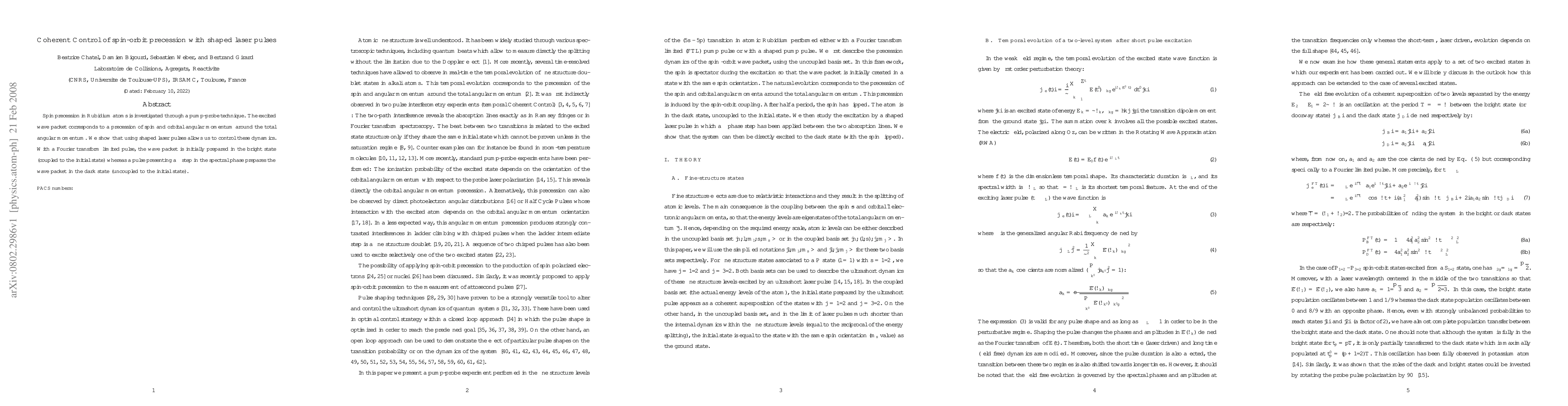 This paper explores the coherent control of spin-orbit precession in Rubidium atoms using shaped laser pulses. Shaped pulses enable manipulation of the dynamics, with Fourier transform limited pulses preparing the wave packet in the bright state and pulses with a $\pi$ spectral phase step preparing it in the dark state.