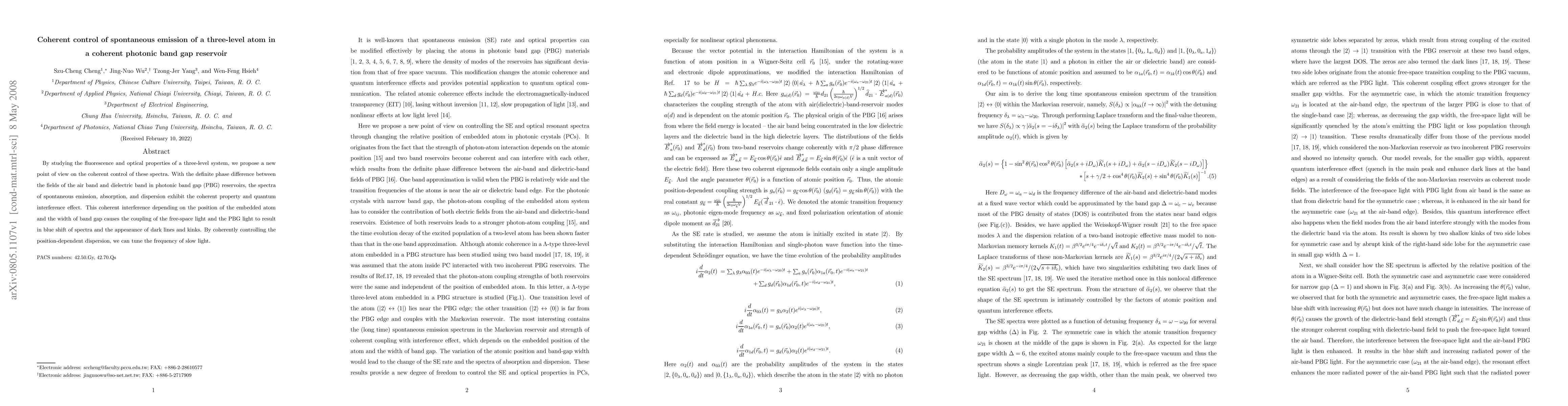 This paper proposes a novel method for coherent control of spontaneous emission in a three-level atom embedded in a photonic band gap reservoir. The coherent interference and quantum effects in the spectra lead to a blue shift and unique spectral features, enabling the tuning of slow light frequency through position-dependent dispersion control.
