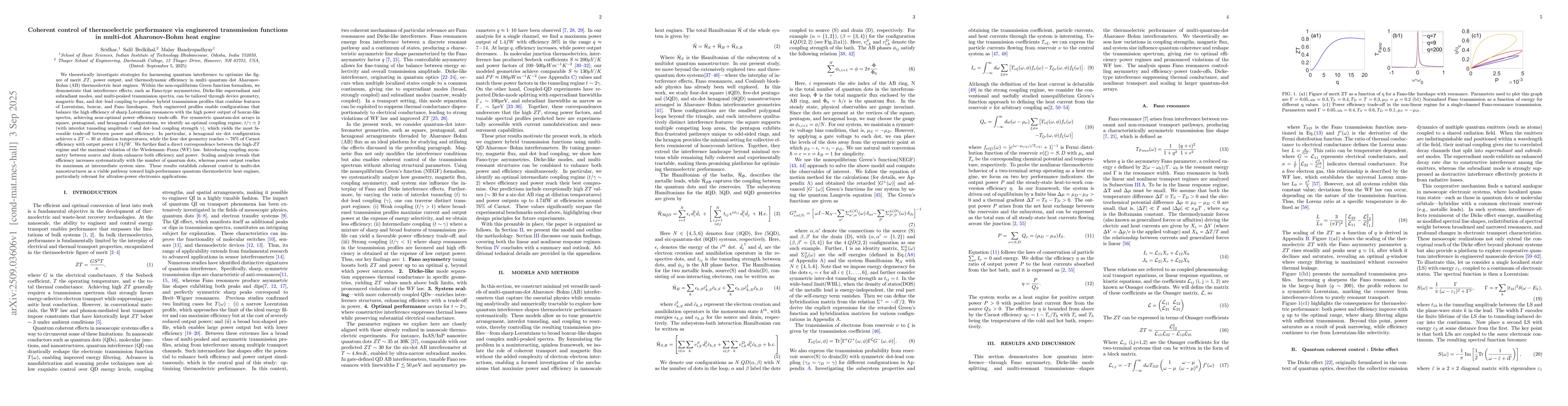 We theoretically investigate strategies for harnessing quantum interference to optimize the figure of merit $ZT$, power output, and thermodynamic efficiency in multi-quantum-dot Aharonov-Bohm (AB) thermoelectric heat engines. Using the non-equilibrium Green function formalism, we show that interference effects such as Fano-type asymmetries, Dicke-like superradiant and subradiant modes, and multi-peaked transmission spectra can be tailored through device geometry, magnetic flux, and dot-lead coupling to produce hybrid transmission profiles that combine Lorentzian, boxcar, and Fano lineshapes. Such engineered profiles enable configurations that balance the high efficiency of sharp Lorentzian resonances with the high power output of boxcar-like spectra, yielding near-optimal power-efficiency trade-offs. For symmetric quantum-dot arrays in square, pentagonal, and hexagonal configurations, we identify an optimal regime, $t/\gamma \approx 2$, where the interdot tunneling amplitude $t$ and the dot-lead coupling $\gamma$ yield the best balance of power and efficiency. A hexagonal six-dot configuration achieves $ZT \sim 30$ at dilution temperatures, while the four-dot geometry reaches about $76\%$ of Carnot efficiency with output power $4.74$ fW. We also find a direct correspondence between the high-$ZT$ regime and maximal violation of the Wiedemann-Franz law. Introducing source-drain coupling asymmetry further enhances both efficiency and power. A scaling analysis reveals that efficiency systematically increases with the number of quantum dots, whereas power output is maximized at intermediate system sizes. These findings establish coherent control in multi-dot nanostructures as a promising pathway toward high-performance quantum thermoelectric heat engines for ultralow-power electronics applications.