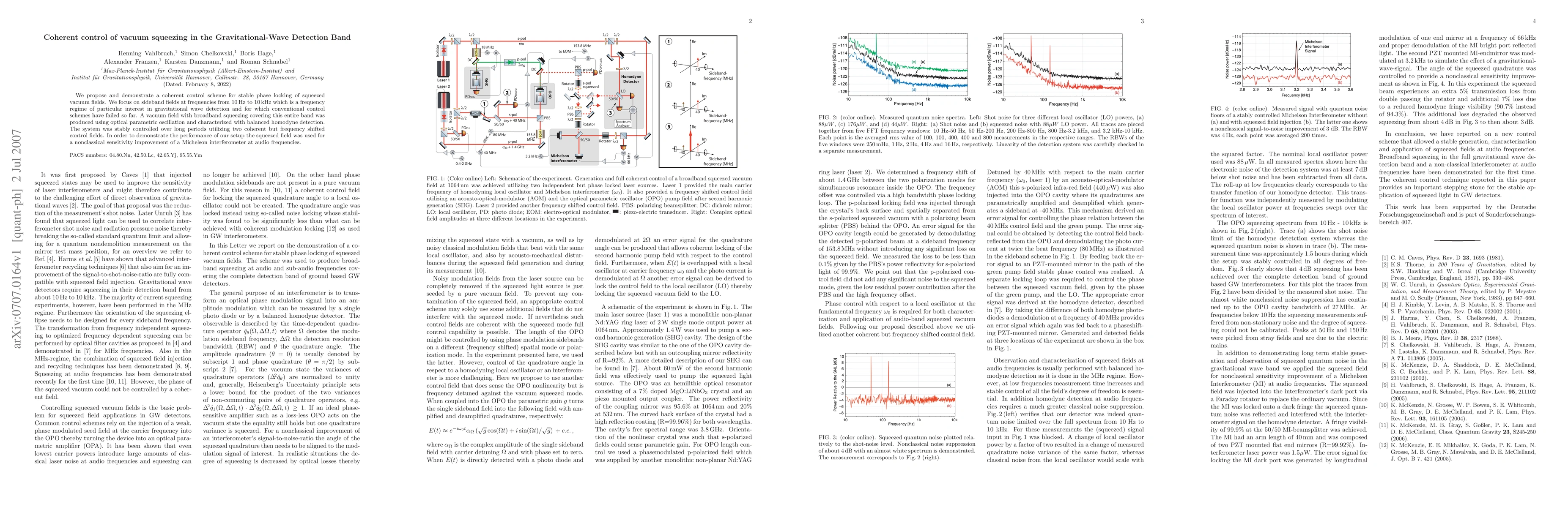 This paper proposes a novel coherent control scheme for stable phase locking of squeezed vacuum fields in the 10Hz to 10kHz frequency range crucial for gravitational wave detection. The method successfully produces broadband squeezed vacuum fields using optical parametric oscillation and demonstrates improved sensitivity in a Michelson interferometer.
