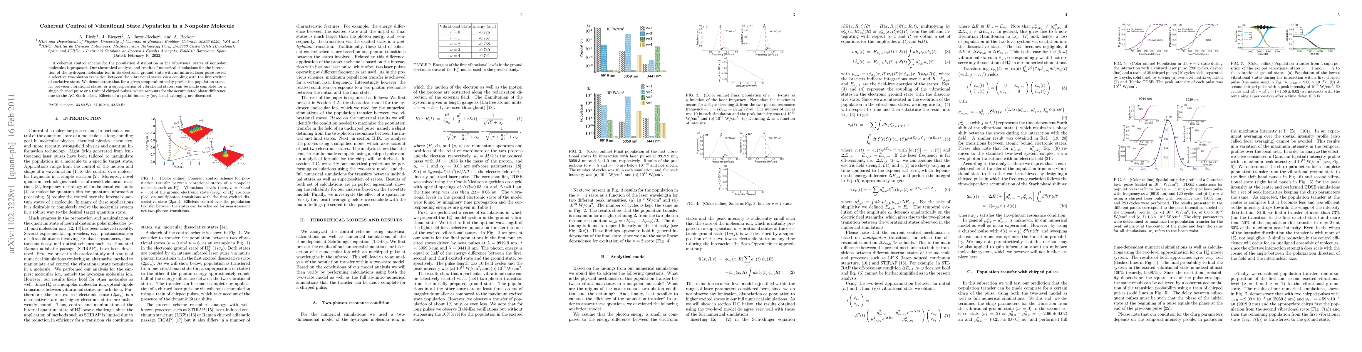 This paper proposes a coherent control method to manipulate the vibrational state population in nonpolar molecules, specifically the hydrogen molecular ion, using chirped infrared laser pulses. Numerical simulations show complete population transfer between vibrational states via coupling with an excited dissociative state, highlighting the role of the AC Stark effect and the effects of spatial intensity averaging.