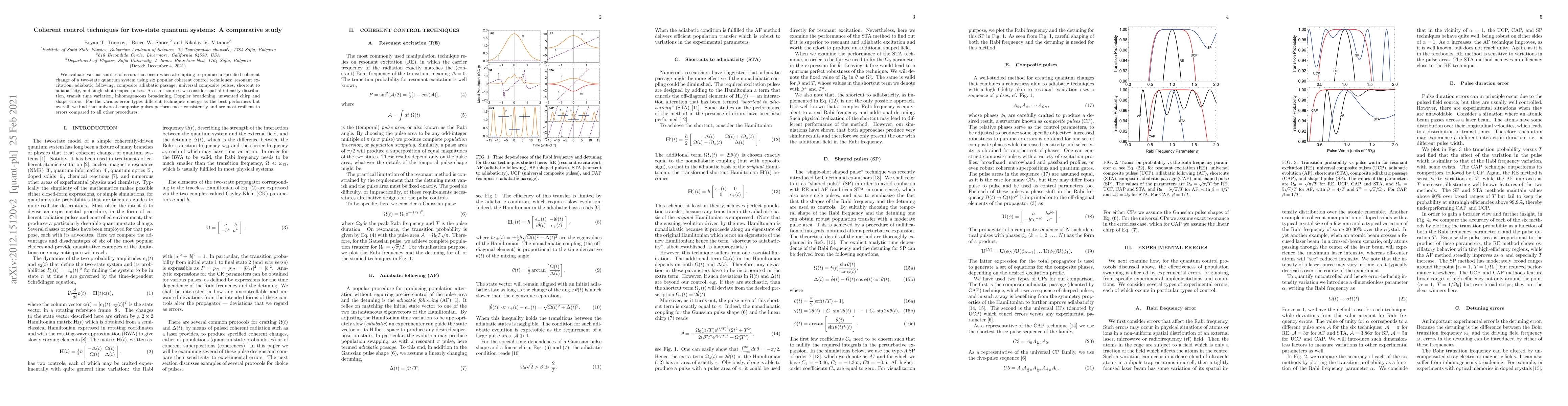 This research compares six coherent control techniques for two-state quantum systems, analyzing their performance under various error types like intensity distribution, transit time variation, and broadening effects. Universal composite pulses are identified as the most consistent and resilient method across different error scenarios.