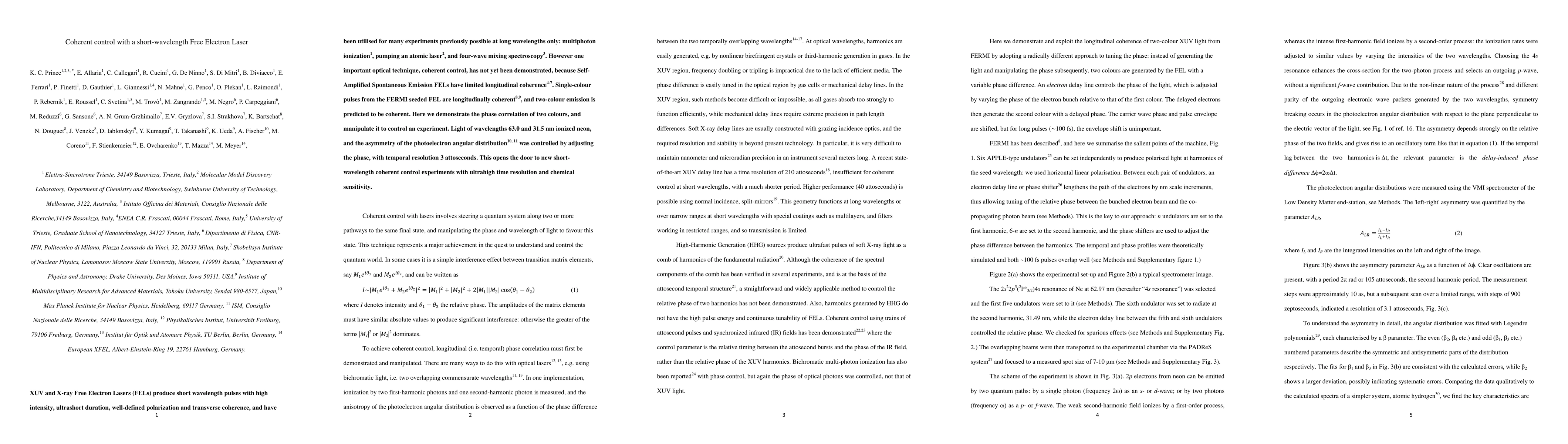XUV and X-ray Free Electron Lasers (FELs) produce short wavelength pulses with high intensity, ultrashort duration, well-defined polarization and transverse coherence, and have been utilised for many experiments previously possible at long wavelengths only: multiphoton ionization, pumping an atomic laser, and four-wave mixing spectroscopy. However one important optical technique, coherent control, has not yet been demonstrated, because Self- Amplified Spontaneous Emission FELs have limited longitudinal coherence. Single-colour pulses from the FERMI seeded FEL are longitudinally coherent, and two-colour emission is predicted to be coherent. Here we demonstrate the phase correlation of two colours, and manipulate it to control an experiment. Light of wavelengths 63.0 and 31.5 nm ionized neon, and the asymmetry of the photoelectron angular distribution was controlled by adjusting the phase, with temporal resolution 3 attoseconds. This opens the door to new shortwavelength coherent control experiments with ultrahigh time resolution and chemical sensitivity.